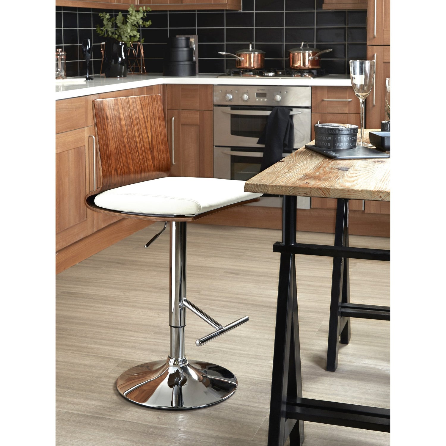 This walnut wood, white leather effect and chrome finish bar chair will look stylish in your home. The padded seat gives optimal comfort. The modern chrome gas lift base allows you to adjust the height in a seamless and smooth movement, with additional comfort given by the footrest. An attractive design that ensures you enjoy breakfast in your kitchen or a drink at your bar area. Dimensions: H41 x W41 x D40cm