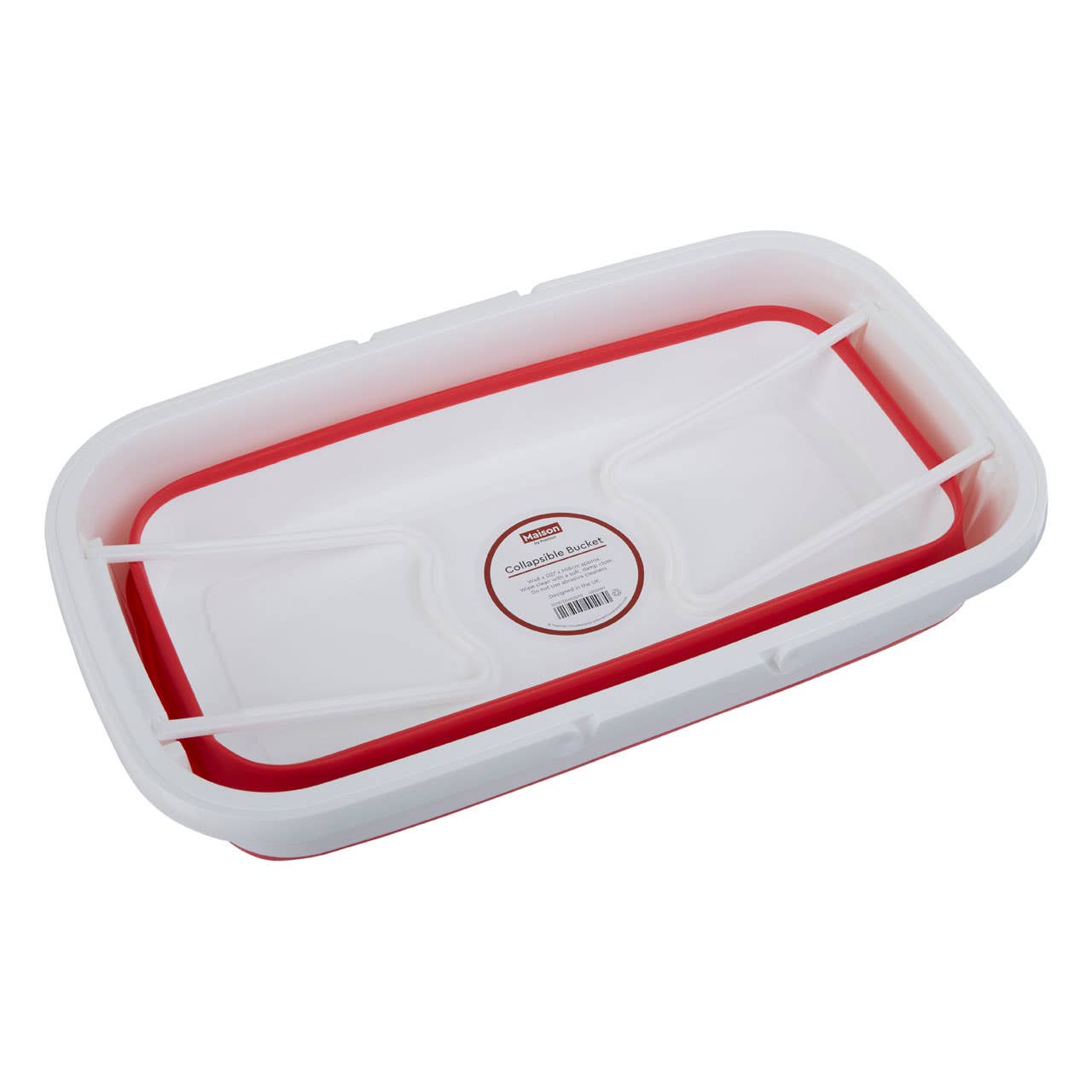 "Made from sturdy PP and eco-friendly rubber, this red and white rectangular shaped basket compacts instantly and can also be used for decluttering homes or storage. The ergonomic handles make it easy to carry this versatile basket without any hassle."