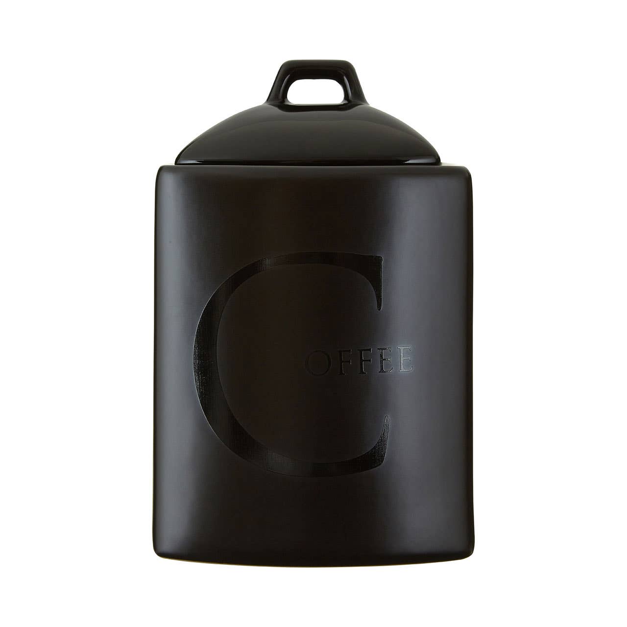"This coffee jar is made from smooth and durable ceramic, with a matte black finish that accentuates the subtle embossed coffee relief. Its lid features a small handle, the domed design complementing the jar's rounded sides. The lid features a rubber seal that keeps it tightly in place while helping to keep the coffee fresh for longer."