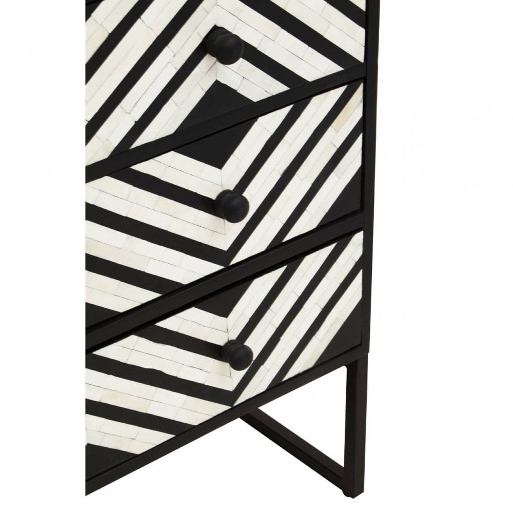 - This chest is defined by hand laid bone inlay detail, forming a rhombus pattern on solid black wood. Three spacious drawers provide plenty of storage, each adorned with a knob grip. The black finish sledge base harmonises with the organic wood and contributes to modern minimalism.