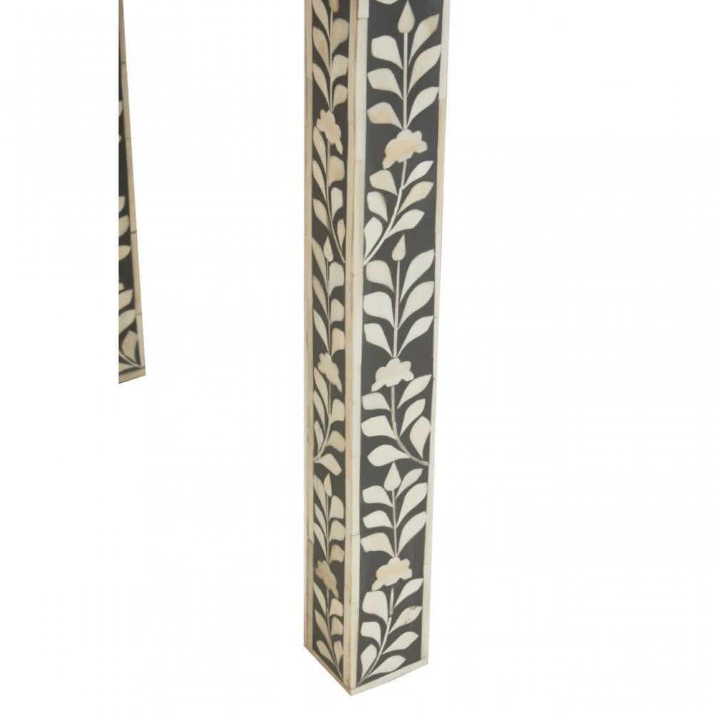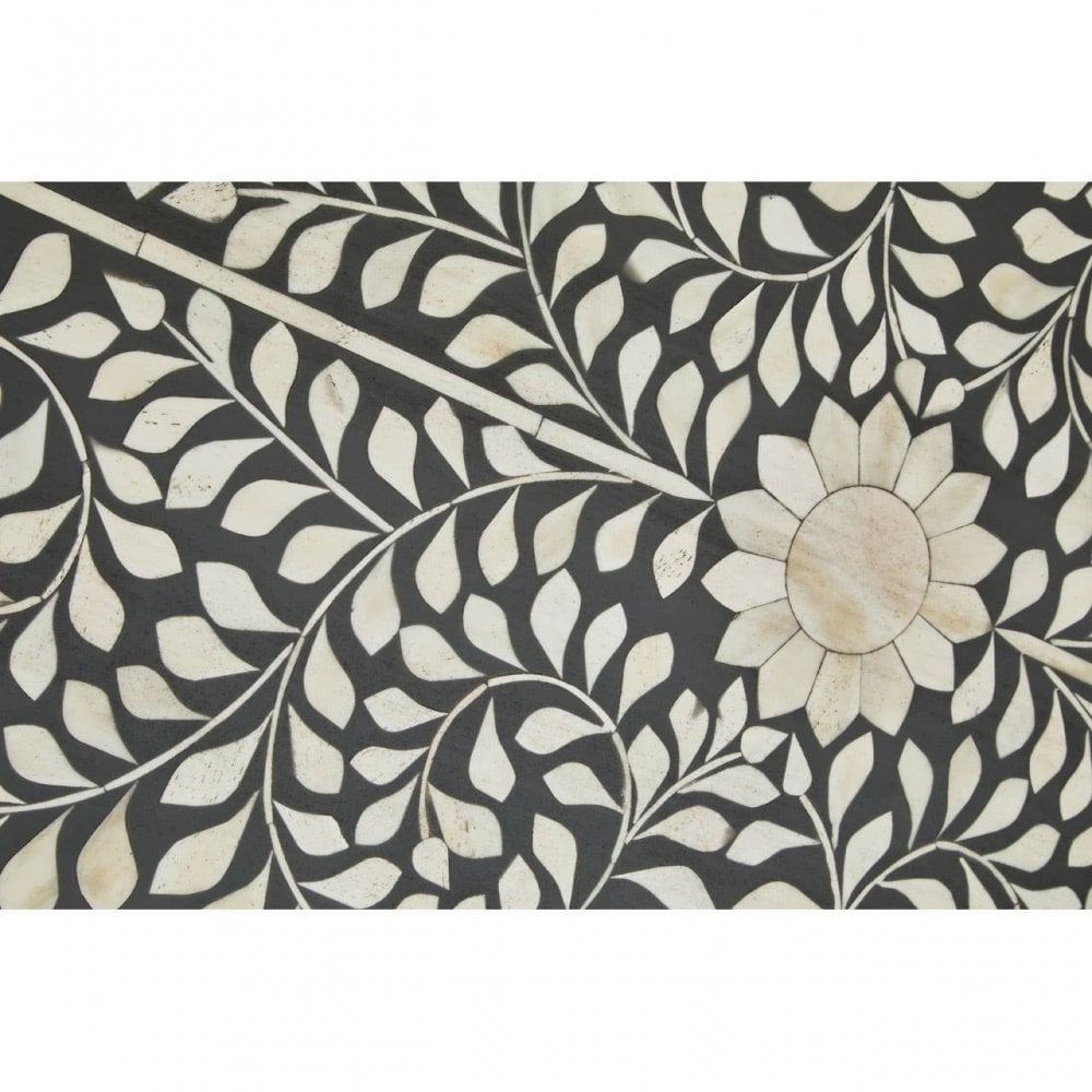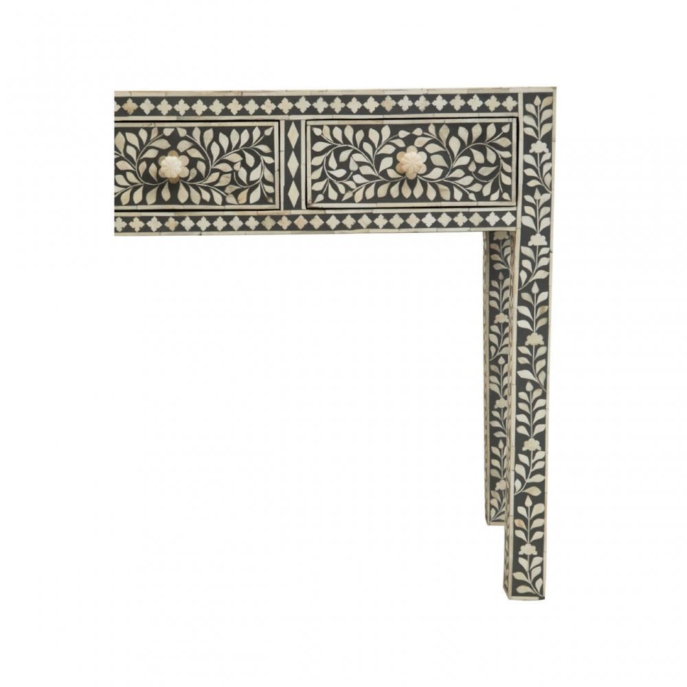 - This traditional study desk features hand laid white buffalo bone detail onto ethically sourced grey wood. Three drawers offer ample storage, each supported with a decorative carved floral grip. The natural bone cutouts form an elaborate floral pattern that lends a timeless aesthetic to the design.