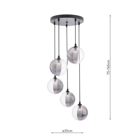 £8200 GBPUnit price /UnavailableIn stock (100 units)Federico 5 Light Cluster Pendant Matt Black With Smoked/Clear Ribbed Glass