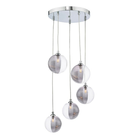 £9500 GBPUnit price /UnavailableIn stock (100 units)Federico 5 Light Cluster Pendant Polished Chrome With Smoked/Clear Ribbed Glass