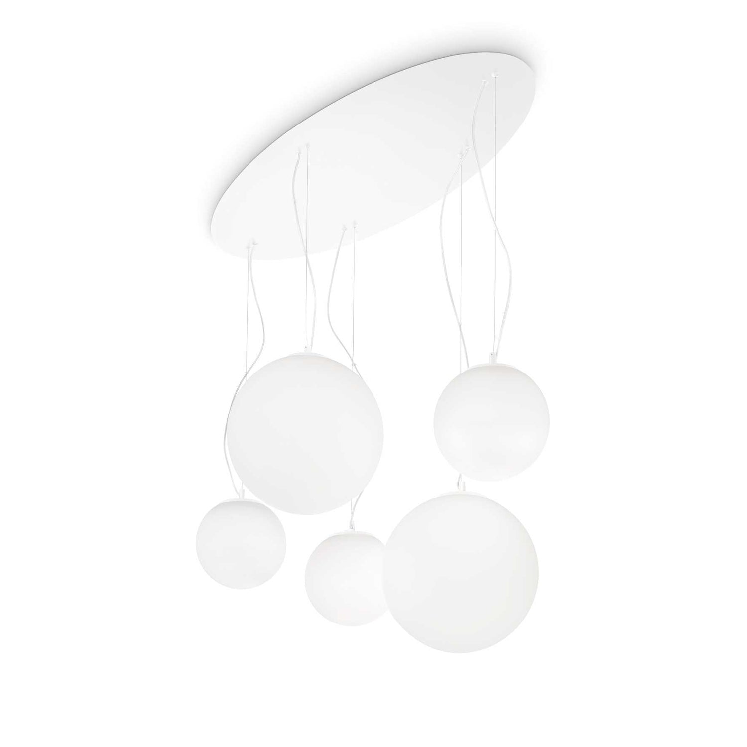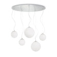 White metal frame. White spherical shape acid-etched blown glass diffuser. Steel cables adjustable in length.