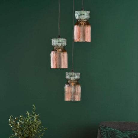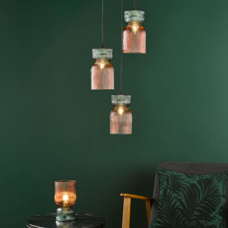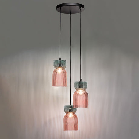 £19100 GBPUnit price /UnavailableIn stock (100 units)Rhubarb 3 Light Cluster Pendant Pink and Green Ribbed Glass