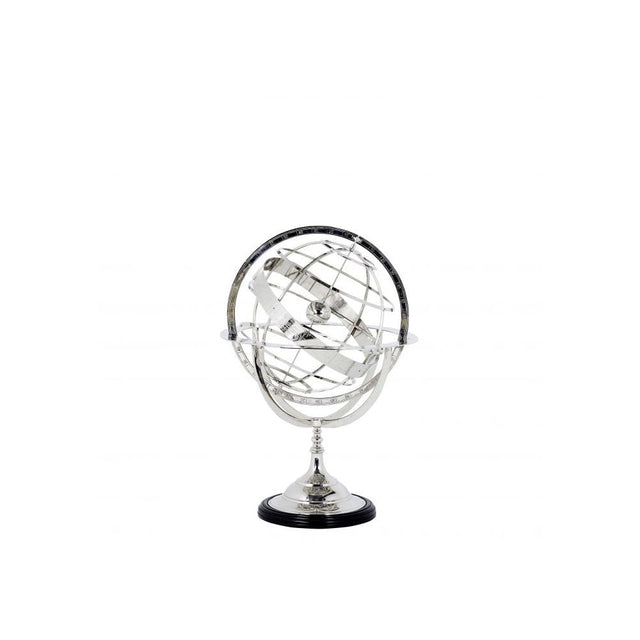 Bring the whole world within reach with this stylish openwork Globe. With its detailed etched zodiac, axis and pedestal with black plinth, this small nickel finished globe lends character to any shelf, desk, or tabletop.