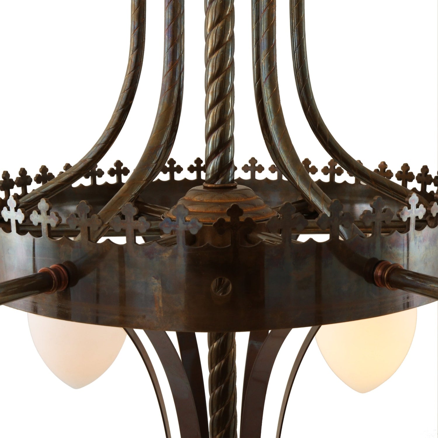 The Killarney chandelier is an ornate, traditional chandelier ideally suited to churches and grand hotels. This solid brass chandelier features four arms and five lights with opal pineapple glass lamp shades. It's also available with.