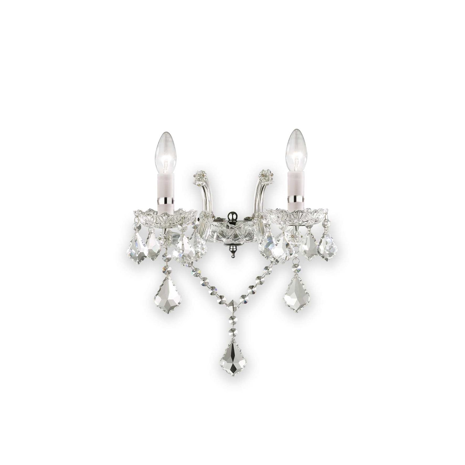 Metal frame with decorative glass elements. Pendants composed of cut crystal octagons and final drops. Available versions: clear glass with golden or silvery metal.