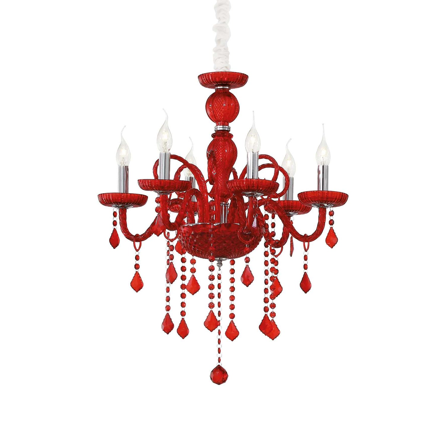 Blown and hand finished glass chandelier with chrome details. Crystal pendants composed of octagons and drops. Velvet chain cover. Available finishes: clear, black and red.