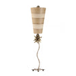 Star-shaped base with gold leaf, taupe and cream striped metal stem spiked with a gold leafed sculpted blossom accent this table lamp. Shade is inverted repeating the taupe and cream striped glaze medium, gold leaf ball-shaped finial.
