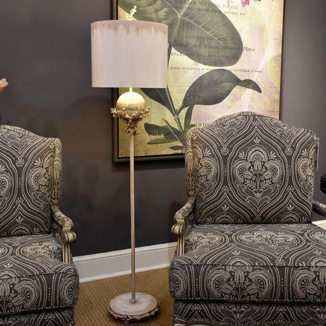 Putty Patina and Silver Leaf Trellis Floor Lamp with Hand-Painted Cylinder Shade