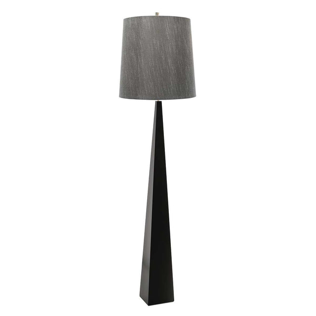 Black-painted steel tapered column floor lamp with Polished Nickel accents. Includes a Dark Grey faux silk hard-backed shade. LS3012
