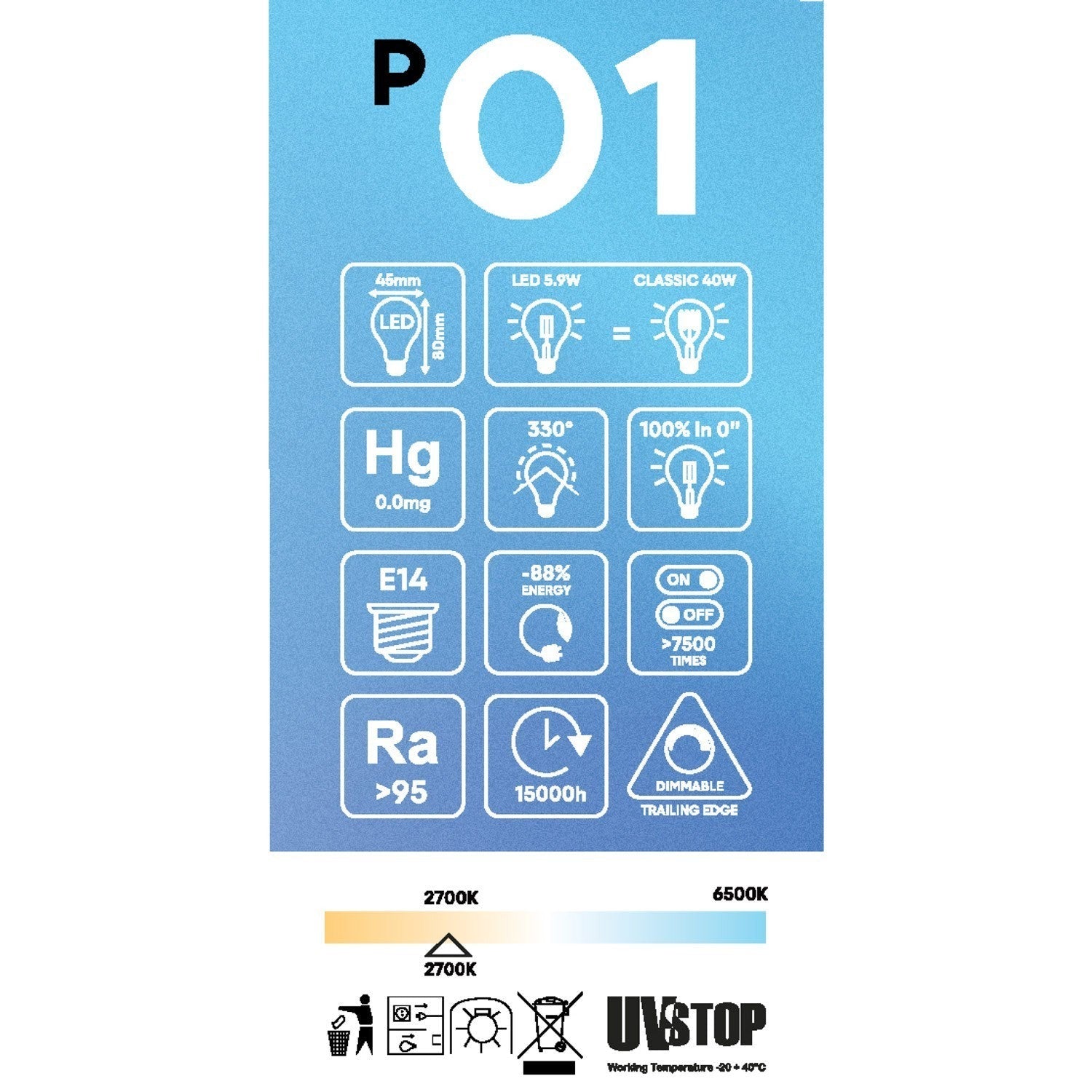 The LED bulb with E14 fitting, CRI 95 color rendering index, G50 shape, porcelain-effect glass finish, 5.9W, 2700K dimmable is a high-quality product that offers a homogeneous, warm and welcoming light, ideal for lighting domestic environments such as living rooms, bedrooms and kitchens.