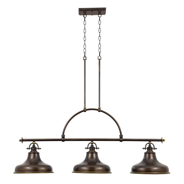 Emery is a classic Americana metal pendant series which adds a nostalgic flair to any kitchen island or dinner table. The large 3 light island pendant is a statement piece and is available in a Palladian Bronze finish. They include prismatic lens diffusers for a soft, even light.