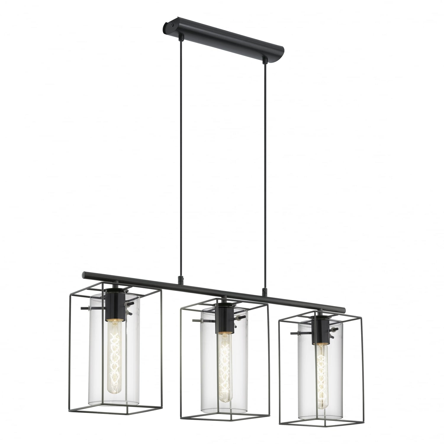 Eglo Glass Ceiling Pendant surrounded by blame steel frame, this range of pendant also comes in a 1 light ceiling pendant rather them 3 lights.