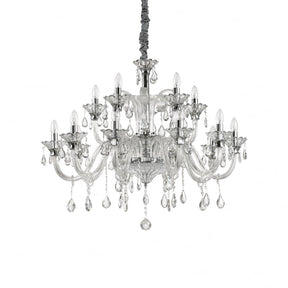 Chrome metal frame and details. Blown clear glass arms with smoky grey or ivory white inner side. Transparent glass and cut crystal pendants and decorative elements. Velvet chain cover.