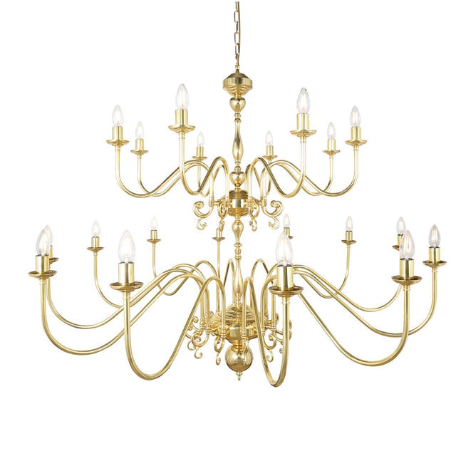 The Flemish brass chandelier is an impressive traditional design hosting 20 unique candle-style lamp holders. This two-tier chandelier is one of three traditional brass chandeliers in the Flemish collection.