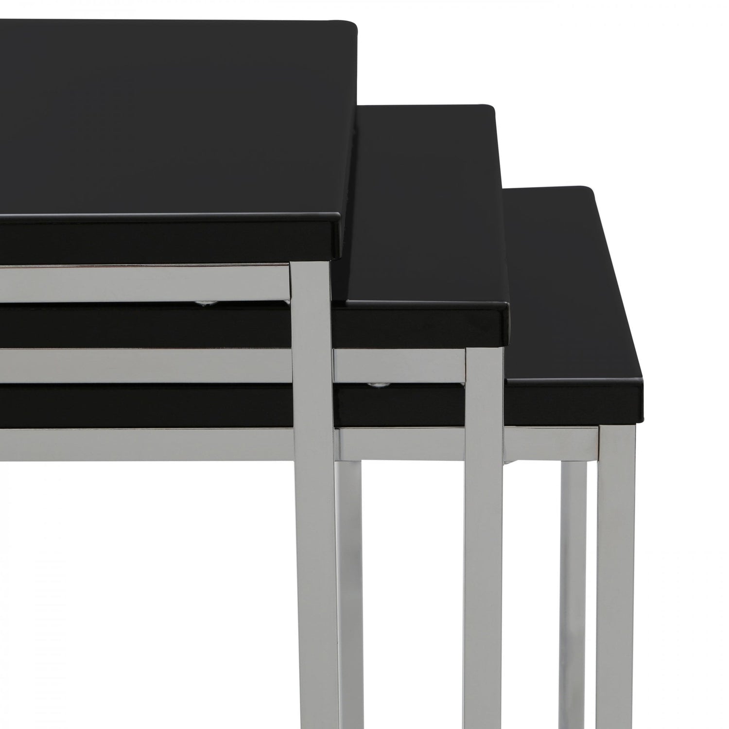 - Features: Reflective chrome metal frames, Contemporary high gloss surfaces, Nesting set of 3, Space saving tables, Compact storage.