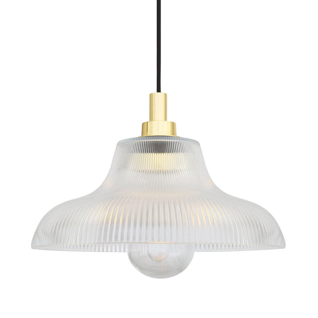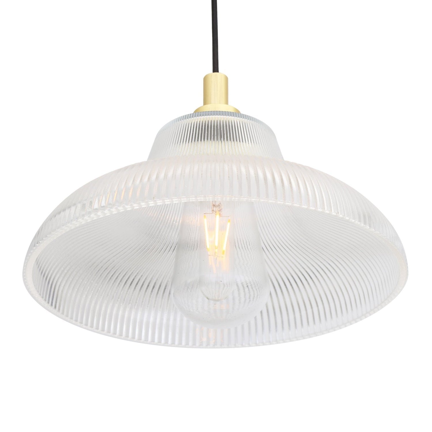 The Aquarius pendant is a classic railway pendant suitable for use in bathrooms and outdoor areas. It features a 30cm Holophane glass pendant attached to a waterproof bulb holder that can be finished in antique brass,.