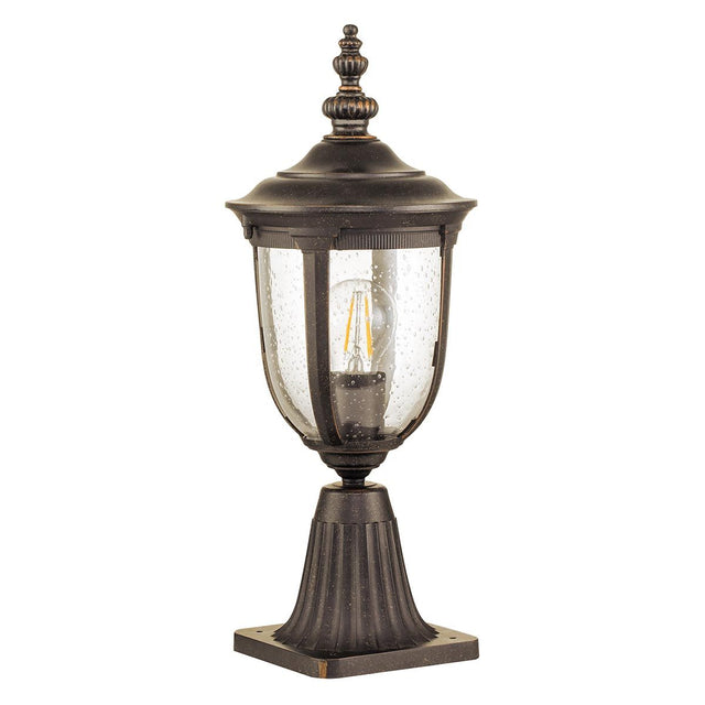 The Cleveland 1Lt Small Pedestal light, constructed of Aluminium with Clear seeded glass and finished in Weathered Bronze, styled with clean classical lines and an appealing curved glass shade. IP44 rated.