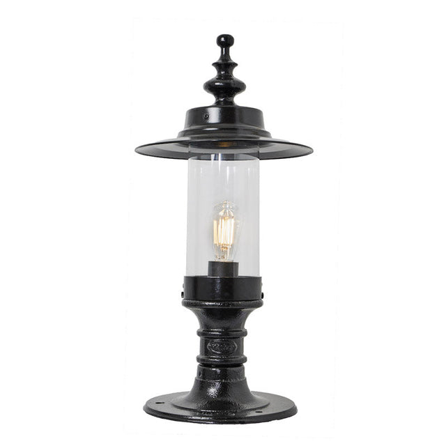 Georgian style pier light in cast iron and steel 0.65m in height for flat piers Inspired by the classical and functional features originating from the Georgian era, the cylindrical design from the Courtyard range allows for maximum lighting spread through the polycarbonate glazing while the ornate capping encloses the light source, reduces light pollution and reflects the light spread downwards.
