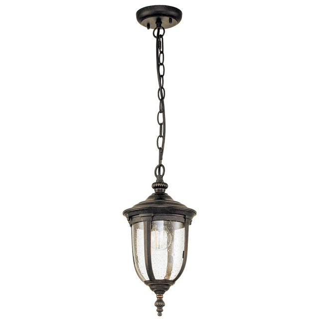 The Cleveland 1Lt Small Chain Lantern, constructed of Aluminium with Clear seeded glass and finished in Weathered Bronze, styled with clean classical lines and an appealing curved glass shade. IP44 rated.
