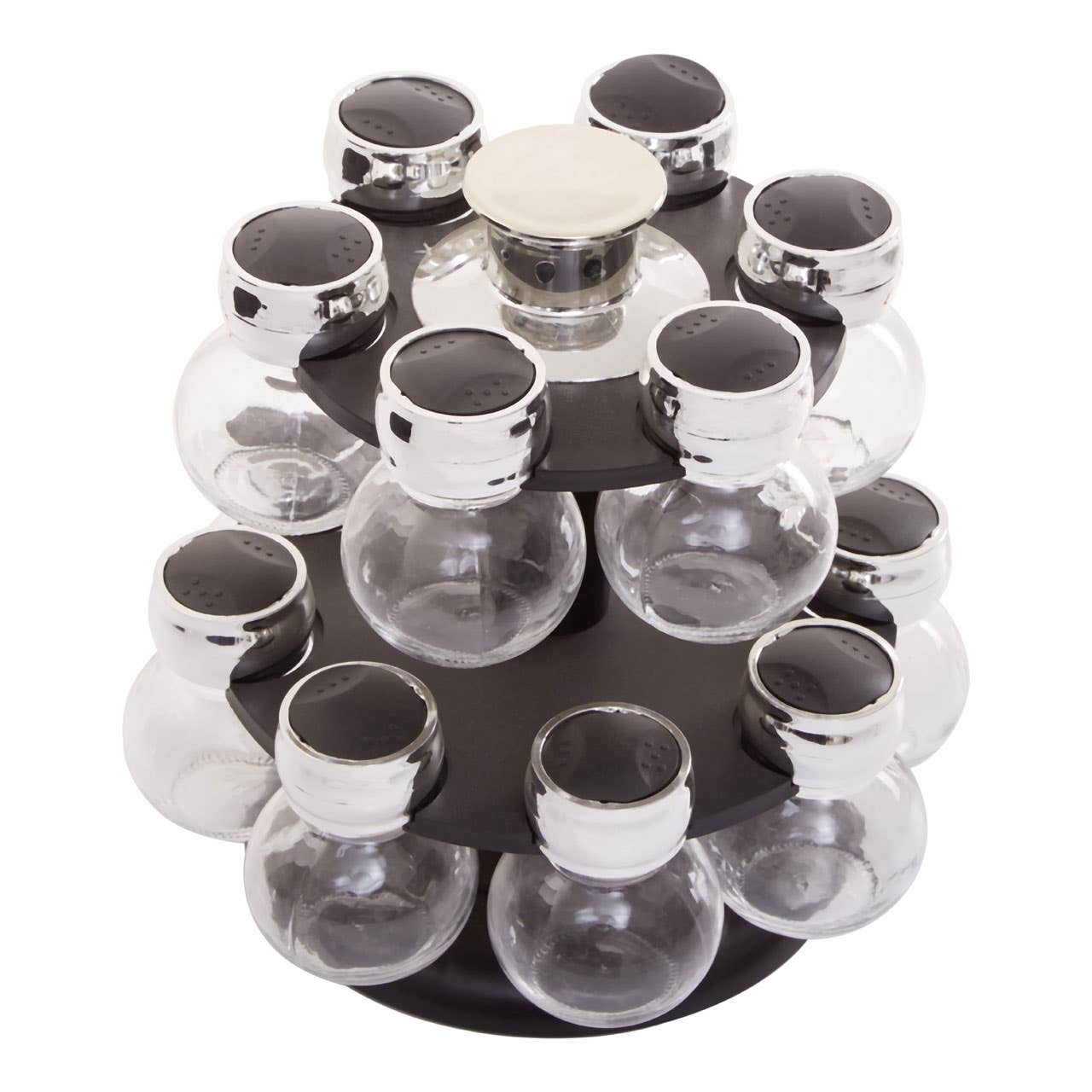 This glass spice jar set is stacked on a double-layer rotating shelf. Each transparent glass container has a silver finish lid and is clear in colour for easy identification of spices.