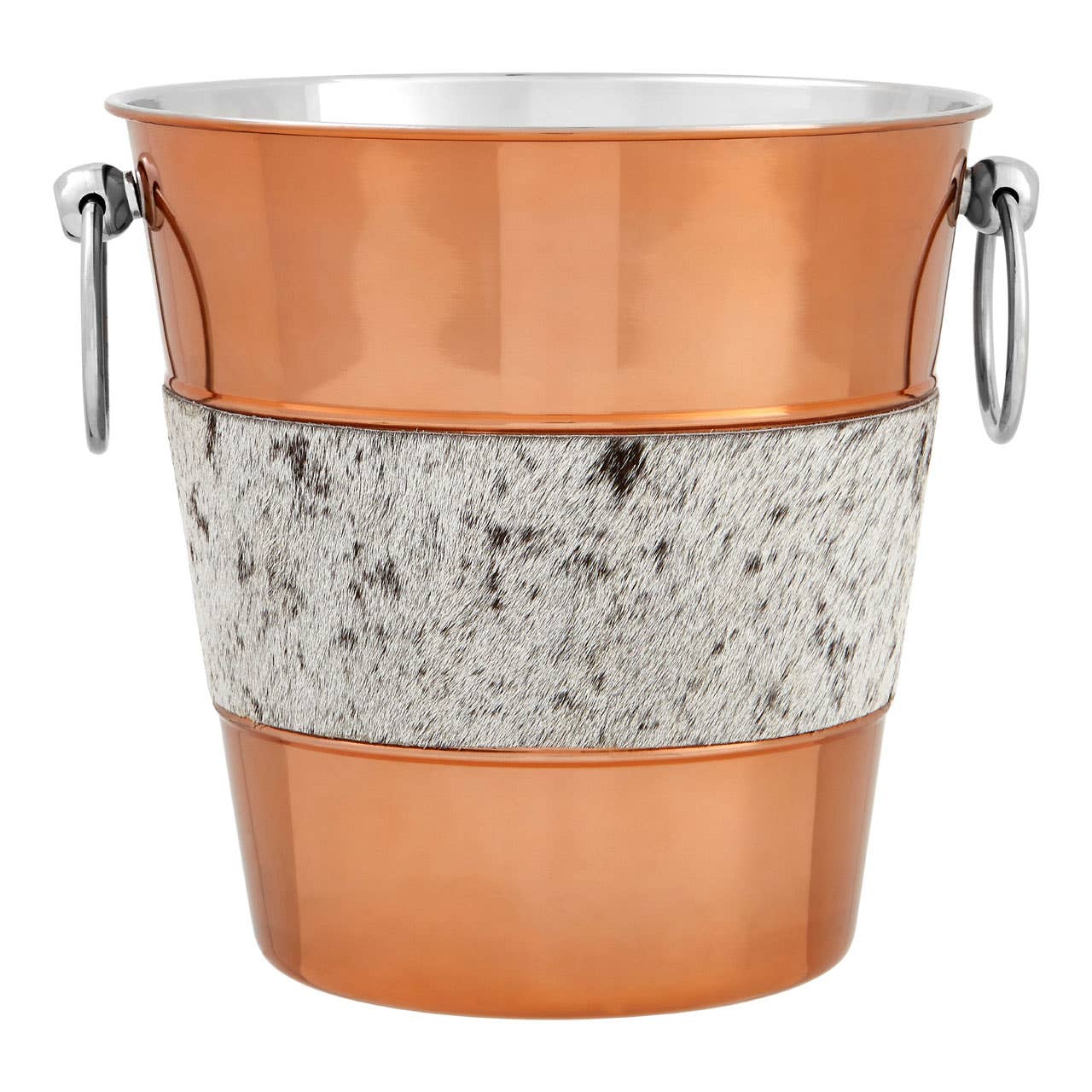 This contemporary bucket is made from non-corrosive stainless steel and has a reflective copper finish. Reflective ring handles adorn each side.