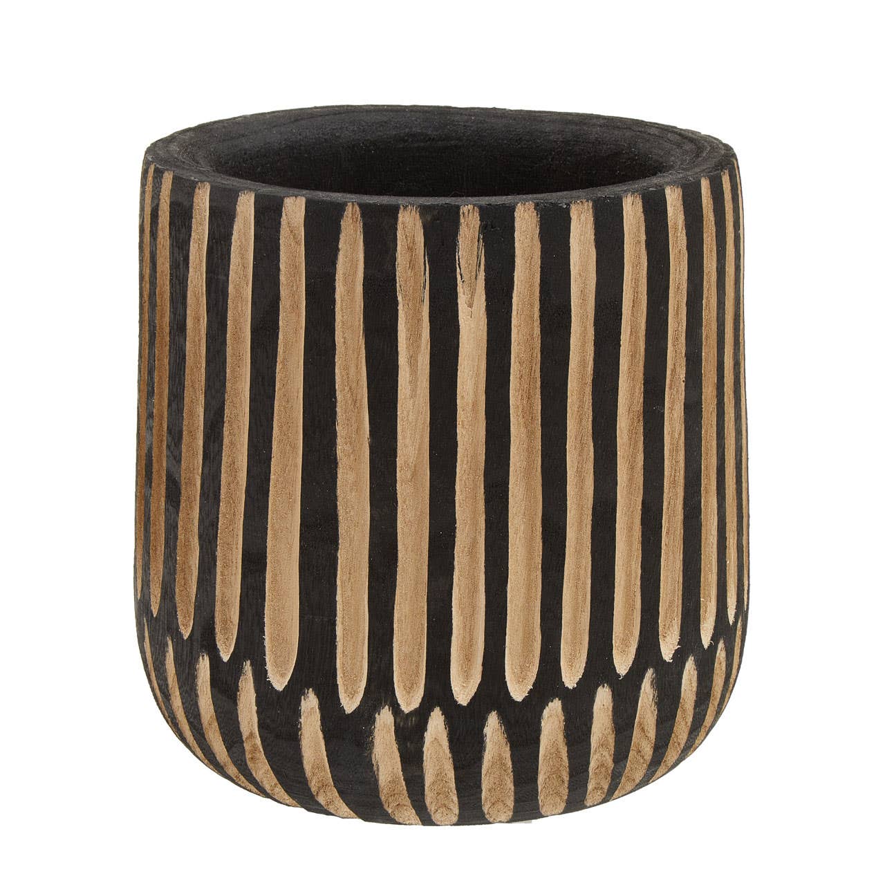 The organic pattern is skilfully engraved in a large wooden planter. The black and natural tones emphasize the rustic nature of this decorative planter, making it a great choice to display plants in an eclectic space.