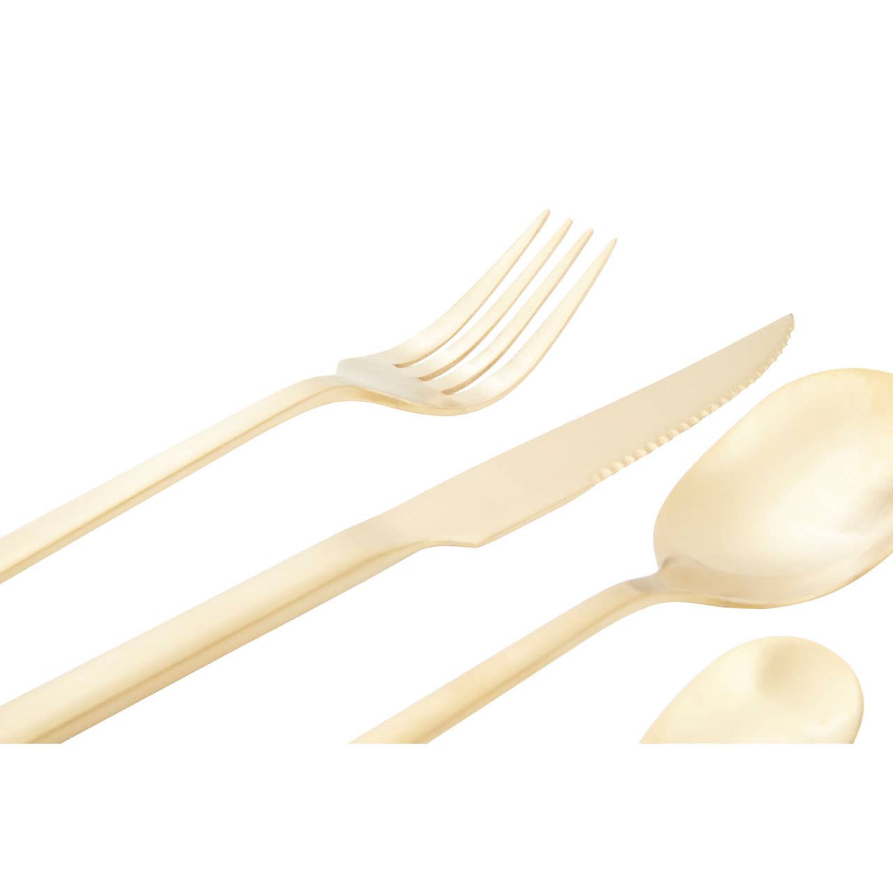 "The Avie 16pc stainless steel cutlery set creates a contemporary aesthetic with seamless formation and curves. Finished in matte gold, each piece has a smooth appearance complete with a tapered handle providing an easy hold and grip."