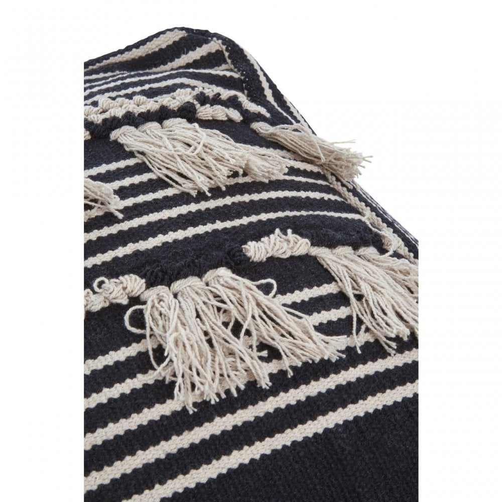 The first thing that stands out with this pouffe is the tassels that texture its surface. Their natural colour stands out against the pouffe's black fabric upholstery. Natural coloured vertical stitching adds to the contrast.