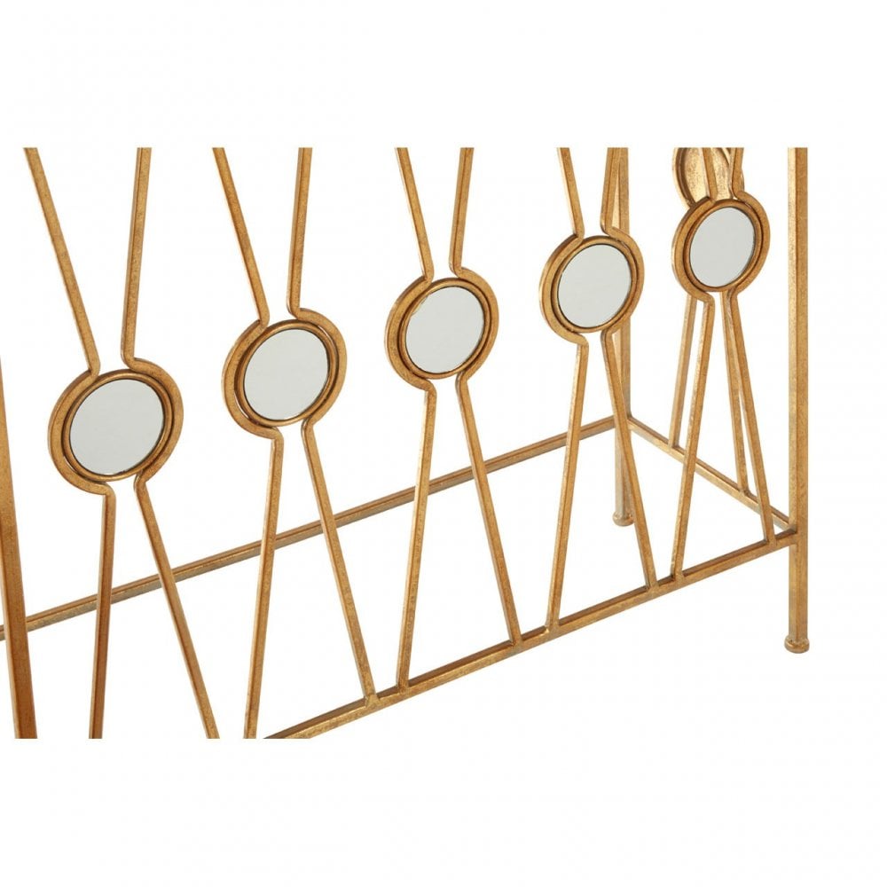 This set of two console tables boast frames made from slightly weathered metal that has a rich gold finish. Their combination of angular and circular lines is inspired by art deco design, with small mirrored accents for a reflective touch. Each one has a top made from glass, coloured black to complement the gold.