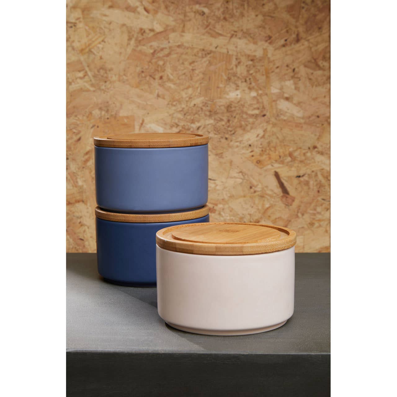 "These canisters are made from smooth and durable dolomite. Two shades of blue are coordinated with dusky pink to produce a muted colour array. Their eco-friendly bamboo lids have an airtight seal, ideal for keeping food fresh. The base of each canister is ridged, allowing them to slot securely into the grooved bamboo lids."