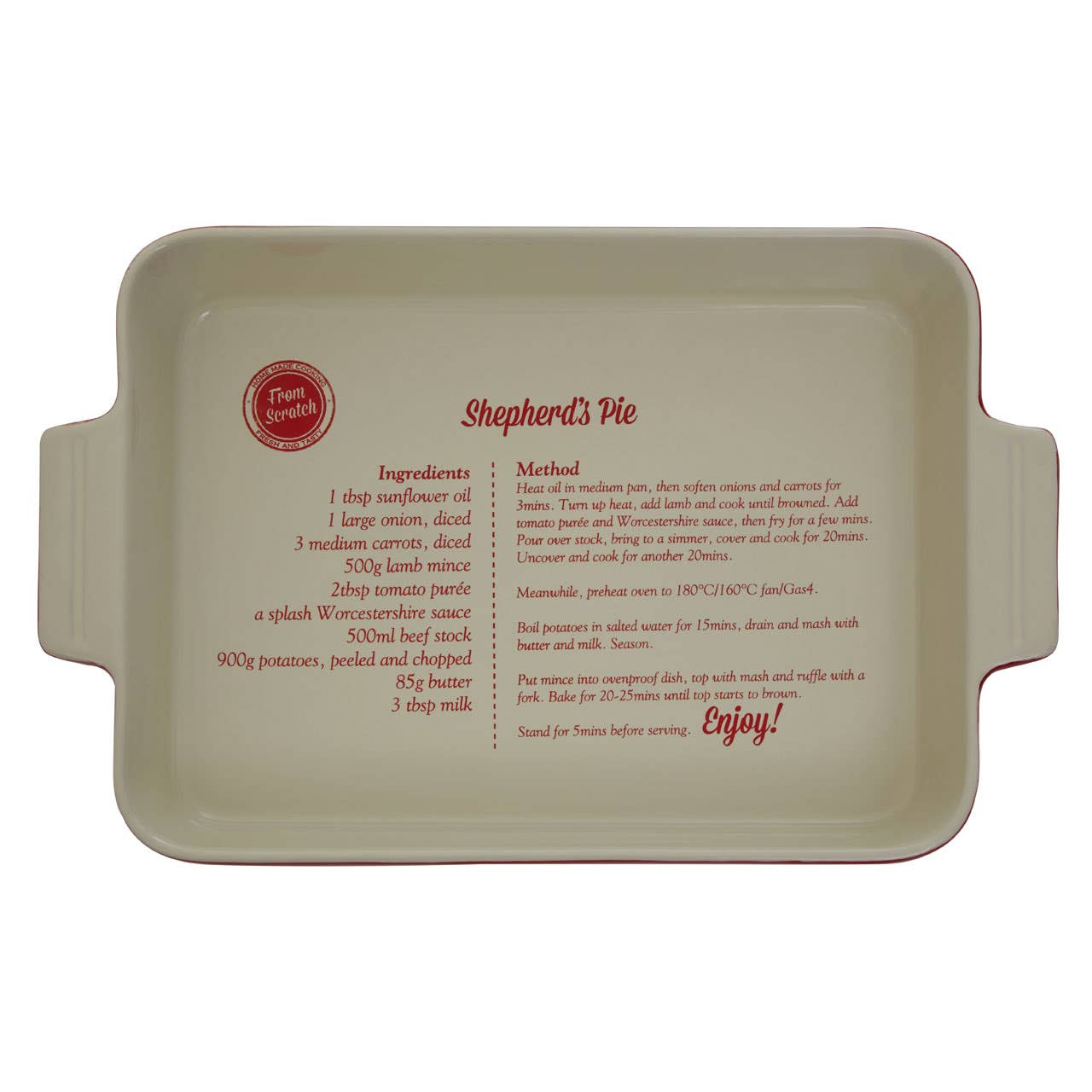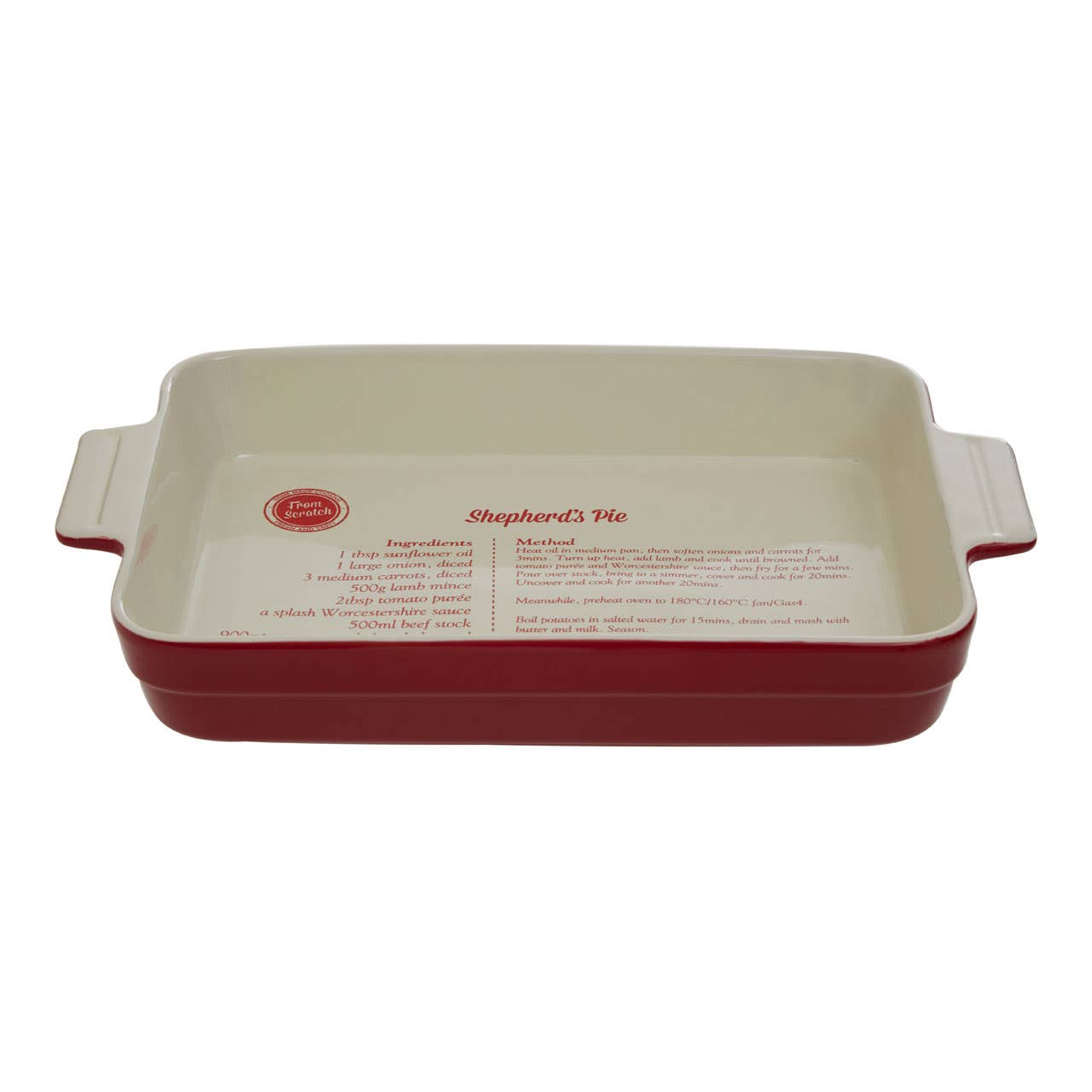 "Ideal for a family of 4, the 3.2 Litre From Scratch oven dish, featuring a recipe for shepherd's pie imprinted on the dish, will help to enhance your culinary skills and make a welcome addition in any kitchen. The dish is made from robust stoneware and has a vibrant red finish on the outside, so it will look just as good on your table as it does in the oven. Written in red, the recipe for our shepherd's pie is accentuated on the cream finish making it easy to read, just remember to take notes if required before you use the dish. The dish is heat resistant up to 230 and is easy to clean in warm soapy water, so it can be used for a variety of dishes such as steak pies, chicken pies, lasagne and much more. Handles on the dish makes it easier to remove from the oven once ready. Durable enough for everyday use, the From Scratch oven dish is versatile for a number of dishes."
