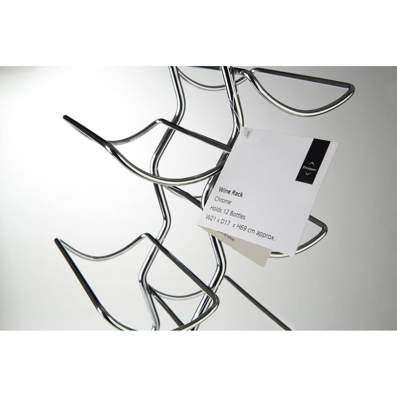 "Its undulating design makes this wine rack an eye-catching addition to the dining area or kitchen. Its central spine supports six rectangular platforms on each side, their curved shape ensuring that the bottle remains securely in place. A wide base keeps the rack stable, while chrome wire material creates a sleek and reflective look."