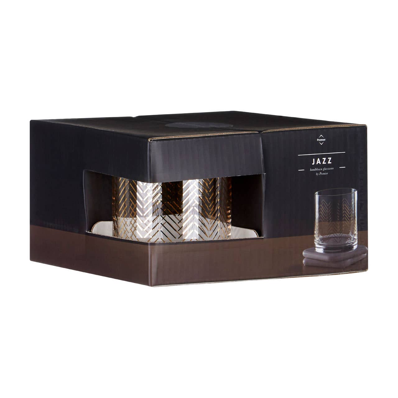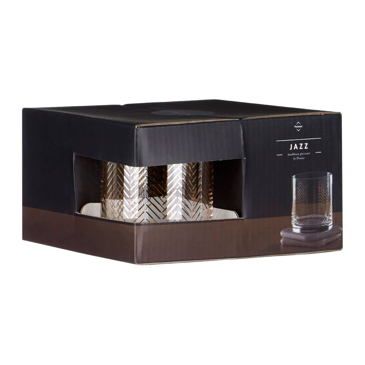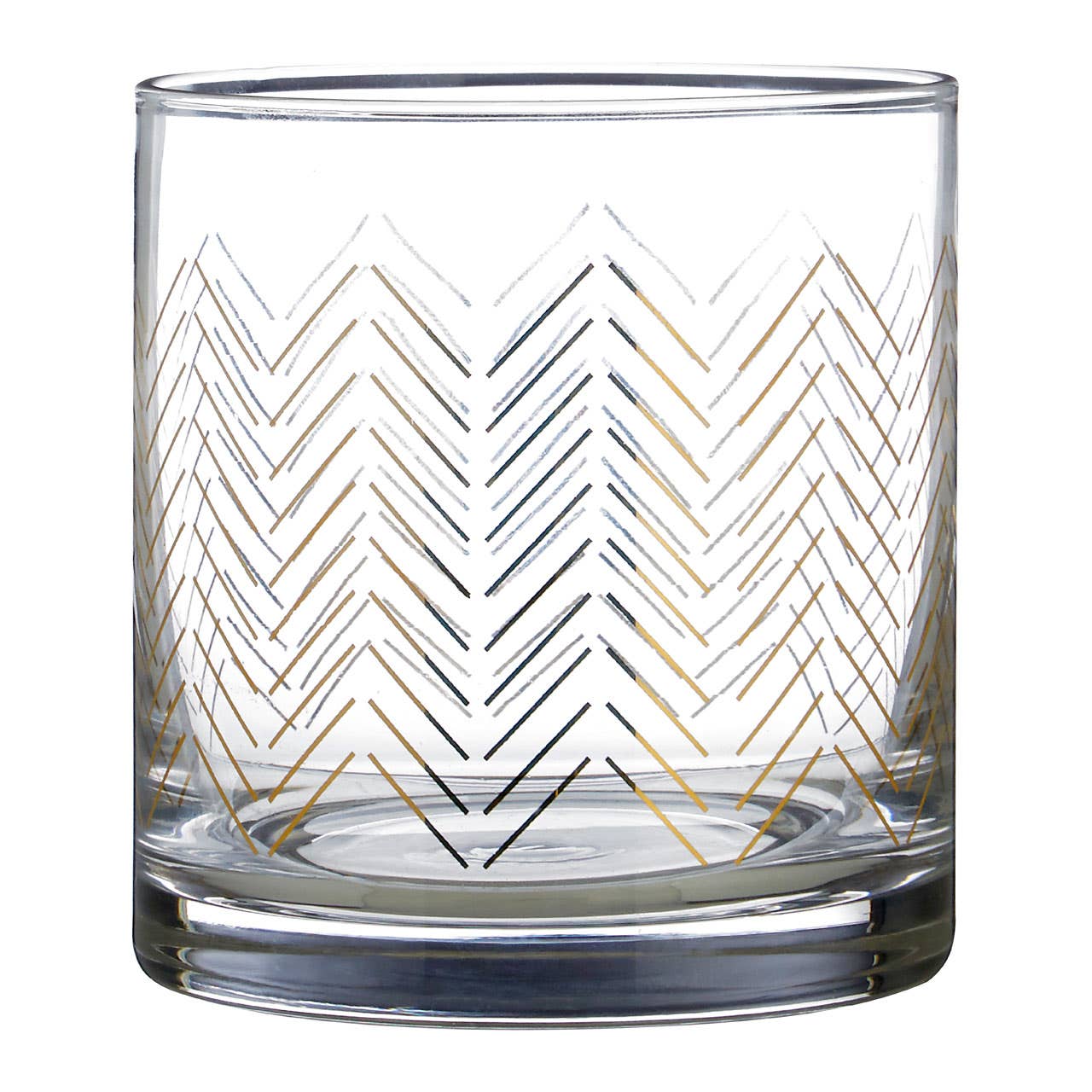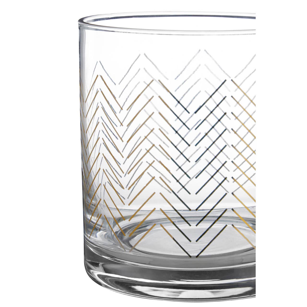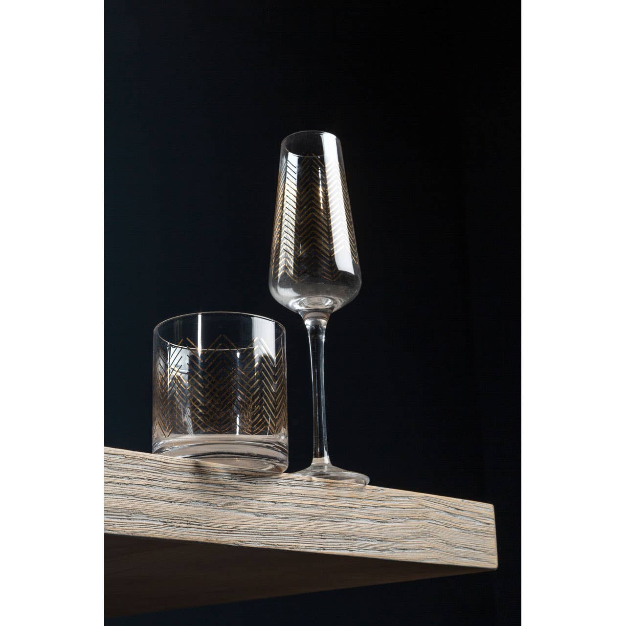 A series of golden lines, forming a wave pattern, travel across the surface of these tumbler glasses. hand blown, they are great for serving a variety of short mixer or soft drinks. Their wide rim means that aromatics will leave the glass unobstructed. Beautifully boxed, they are perfect for gifting.