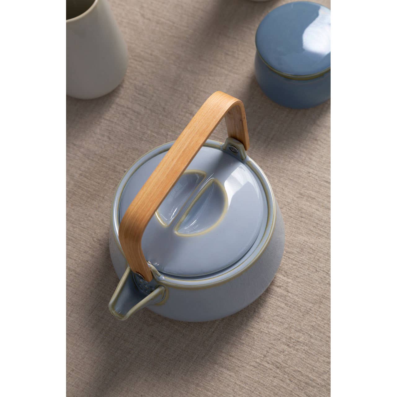 "Made from durable porcelain, this elegantly crafted teapot is topped with a matching lid to retain temperature of the hot beverage. The angled spout is supported by cut out holes to pour tea into the mugs easily. The tapered design of teapot and its spout complements each other while natural coloured handle is contrasted by pastel toned blue coating."