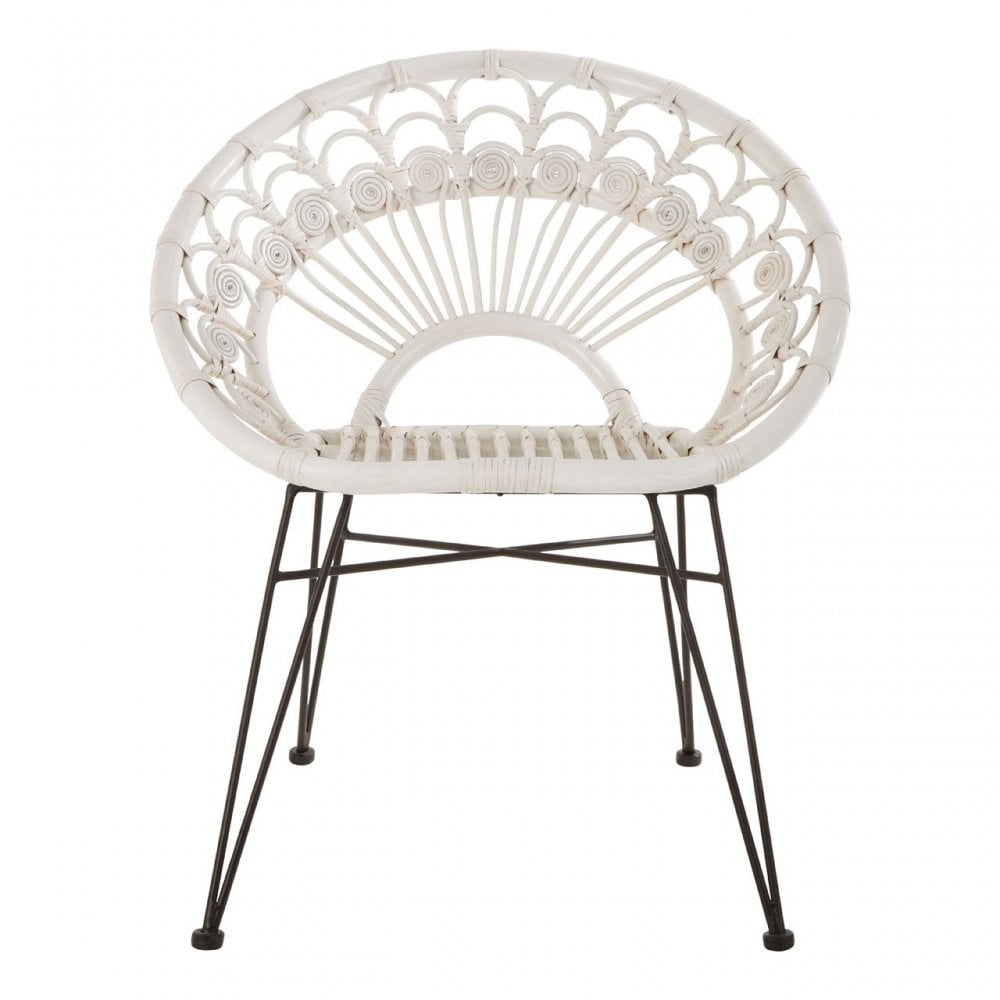 This chair has a study round frame and features an open design construction of white rattan fibers. It is balanced on slightly angled, black finish iron legs which are given an architectural look thanks to their intersecting support design. Each leg has a rounded tip to maintain the chair€™s stability.
