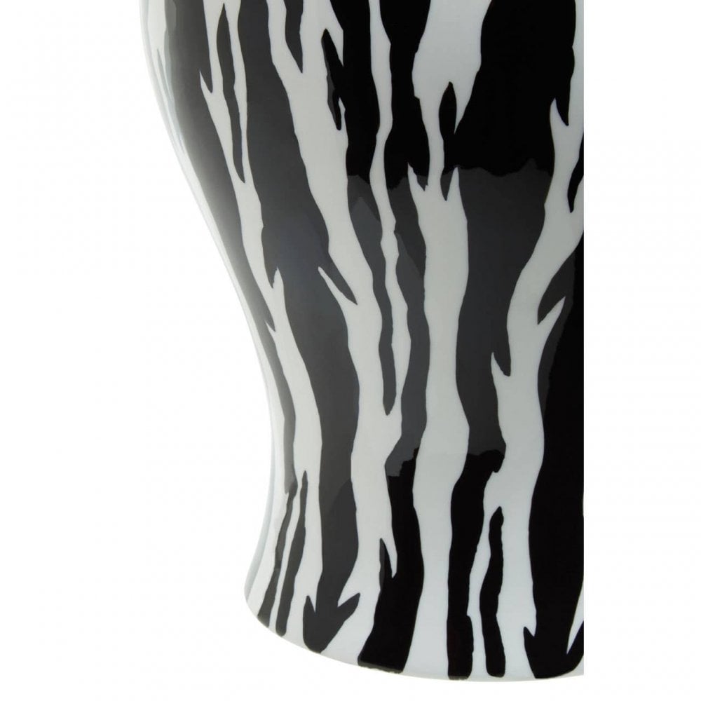 - This small ceramic vase stands out with an elegant urn shape in a smooth glazed finish. An abstract black and white pattern adorns the curved design topped with a removable lid and a decorative finial handle contributing to classic elegance.