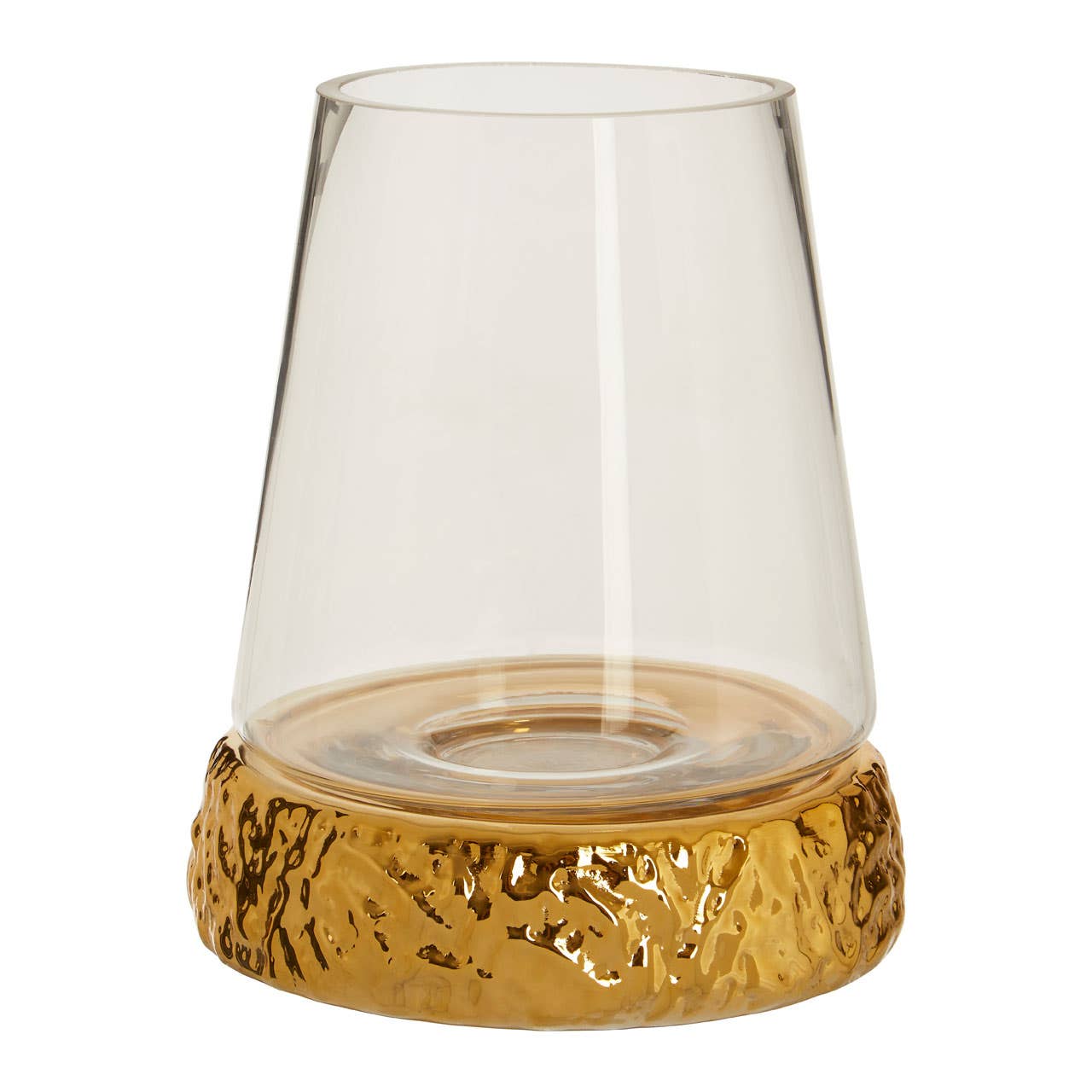 The rounded base of the Martele candle holder is handcrafted from metal and boasts a reflective gold finish. Hammer points create a series of waves and scores, adding subtle texture to the base and creating a shimmering effect when placed under the light. The shade is made from clear glass and has a tapered design. *This item is handcrafted so please expect slight variations to the finish*