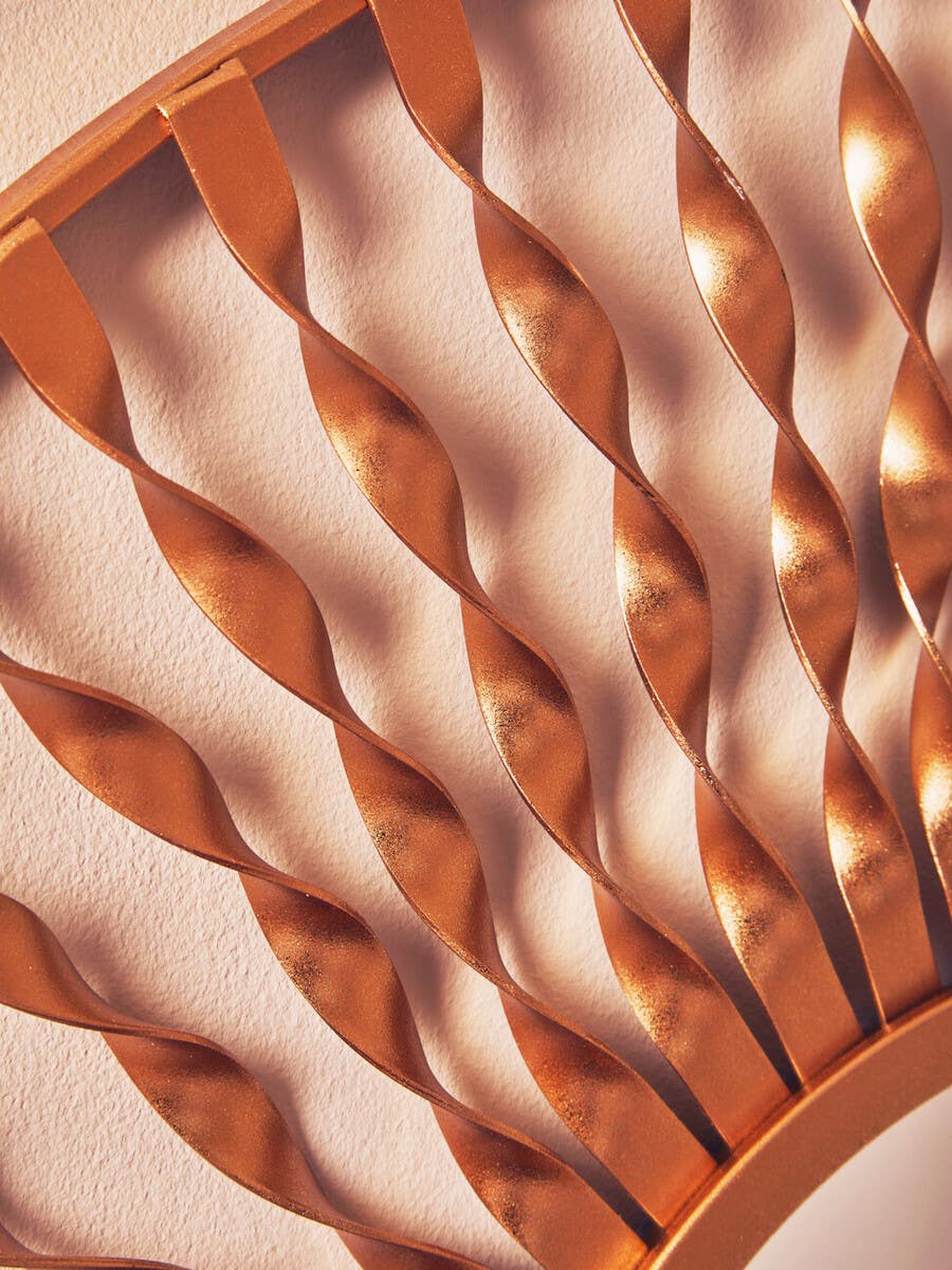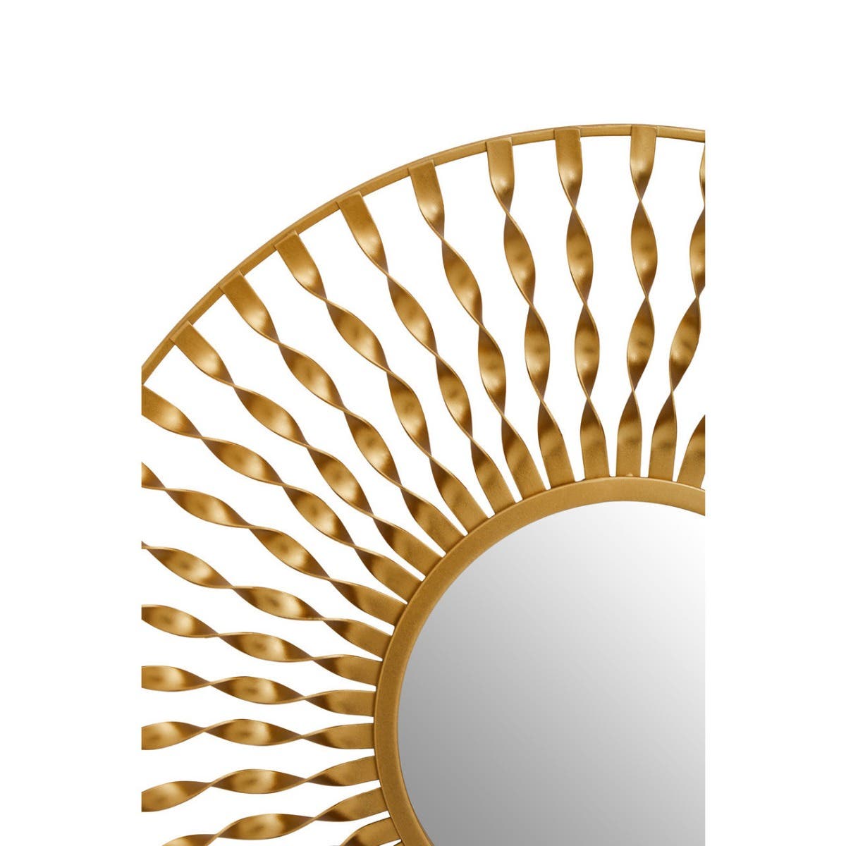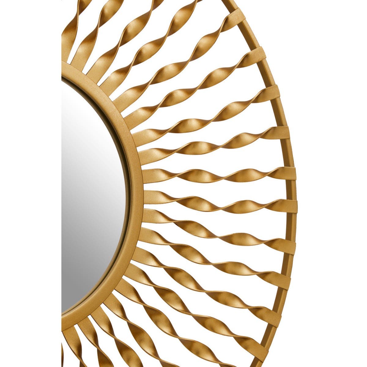 This wall mirror has a sunburst pattern with twisted metal wires connecting to form a graceful circular frame. This decorative mirror can bring art deco charm to any wall with its bold design and golden hue.