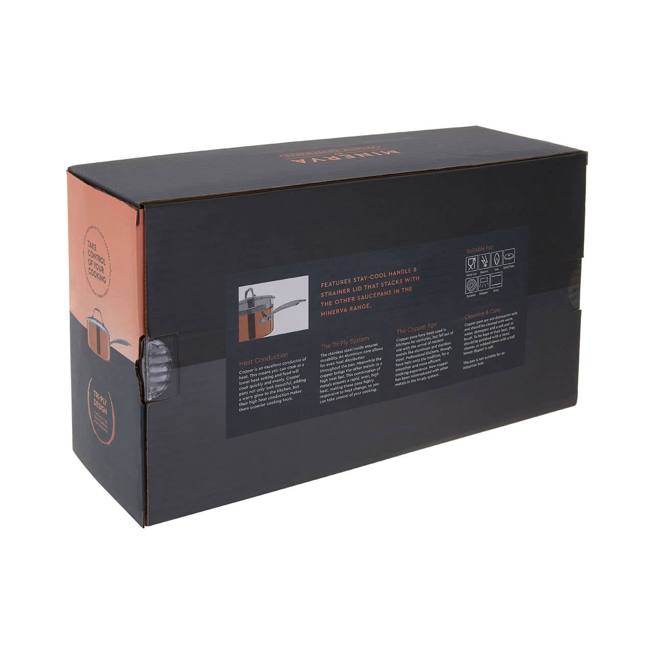 "The Minerva saucepan's copper finish lends a soft and warm metallic hue to the kitchen. Its tri-ply construction means that it conducts heat more effectively than conventional cookware, and distributes it more evenly. Its clear glass lid helps one to keep an eye on cooking, with vents on the side to prevent steam building and make draining easy."