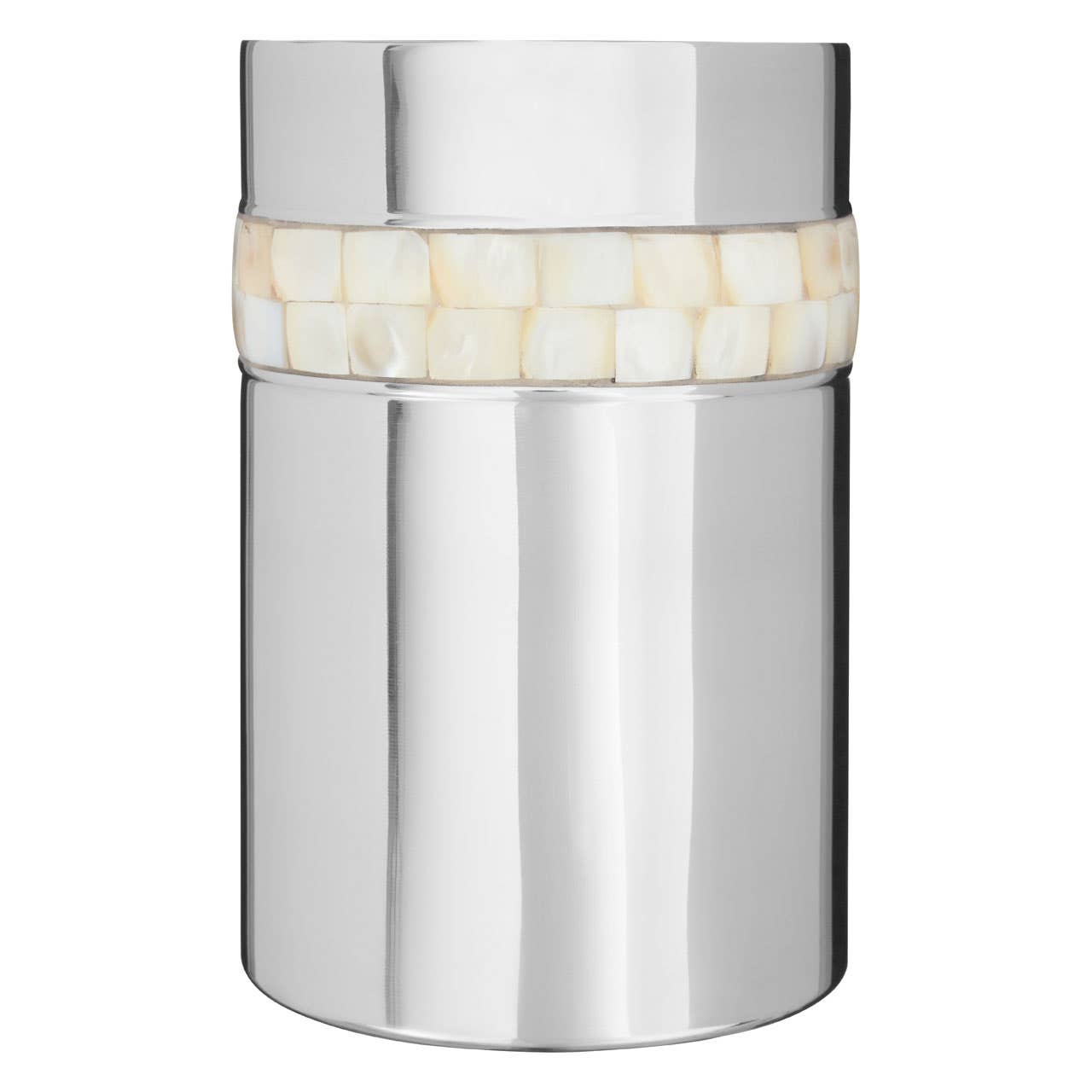 "Square-shaped pieces of mother of pearl form a decorative band around the coolers cylindrical body, forming a natural counterpoint to the reflective metal. Made from tough and durable stainless steel, it makes a beautiful addition to the dining table. Pair it with our Mother of Pearl cocktail shaker and ice bucket."