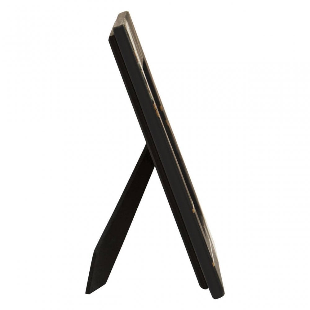 This small rectangular black slate photo frame is inlaid with pearlized shell and gold finish detail to create a luxurious classic accent. The inlay artwork accentuates the natural slate stone and lends a decorative texture to the otherwise understated design.