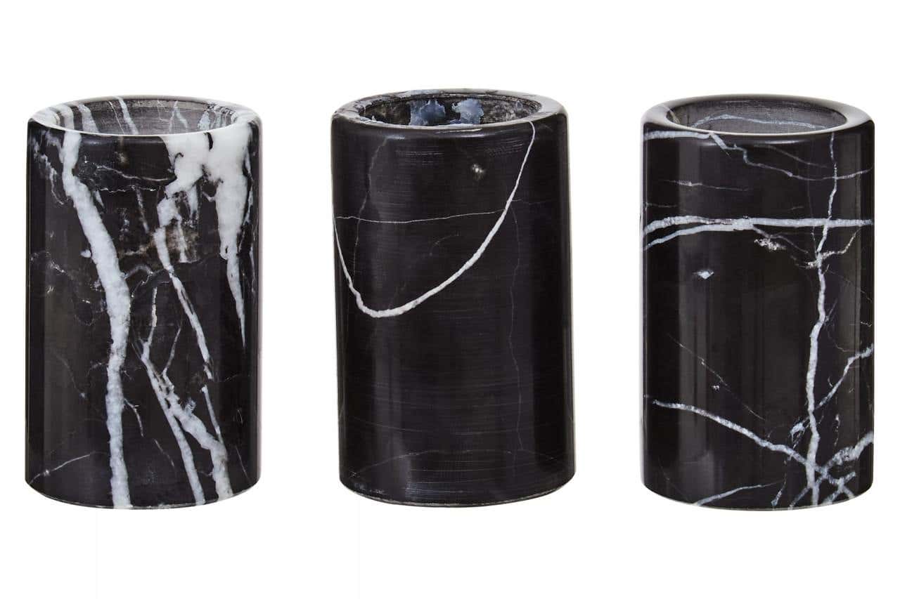 This set of three black marble tealight holders feature a unique assortment of strong white veining, which will contrast the soft glow of the candles inside. The simple pilar design will add to the contemporary aesthetic of the marble.