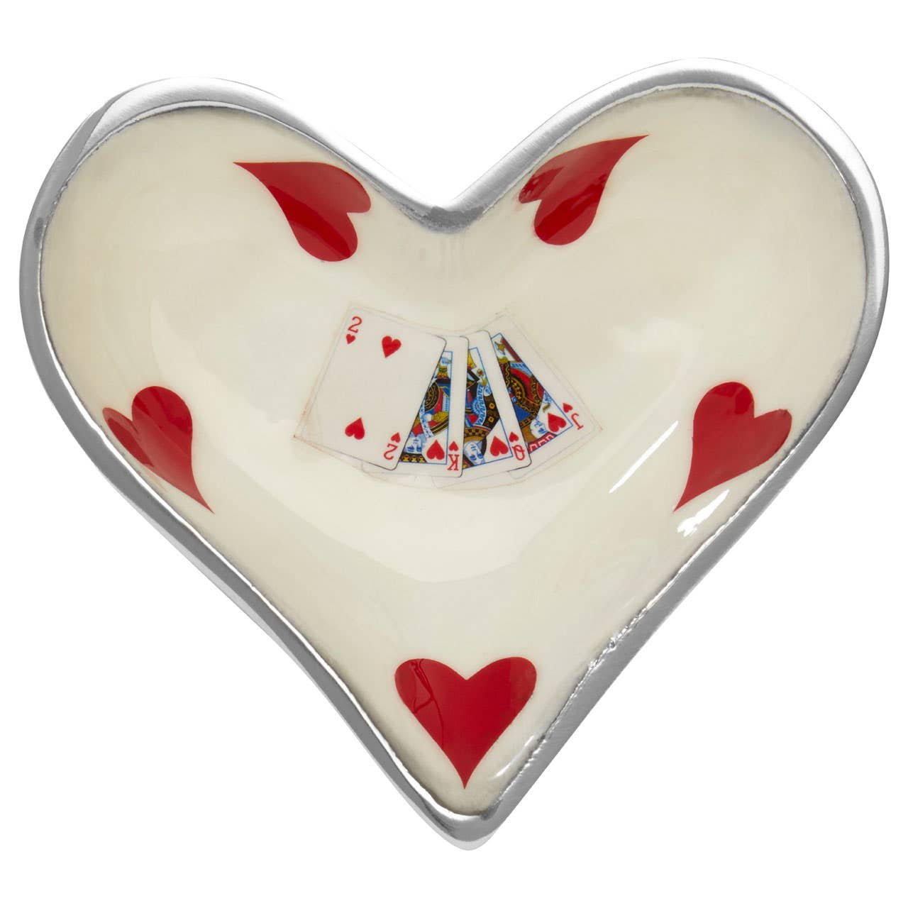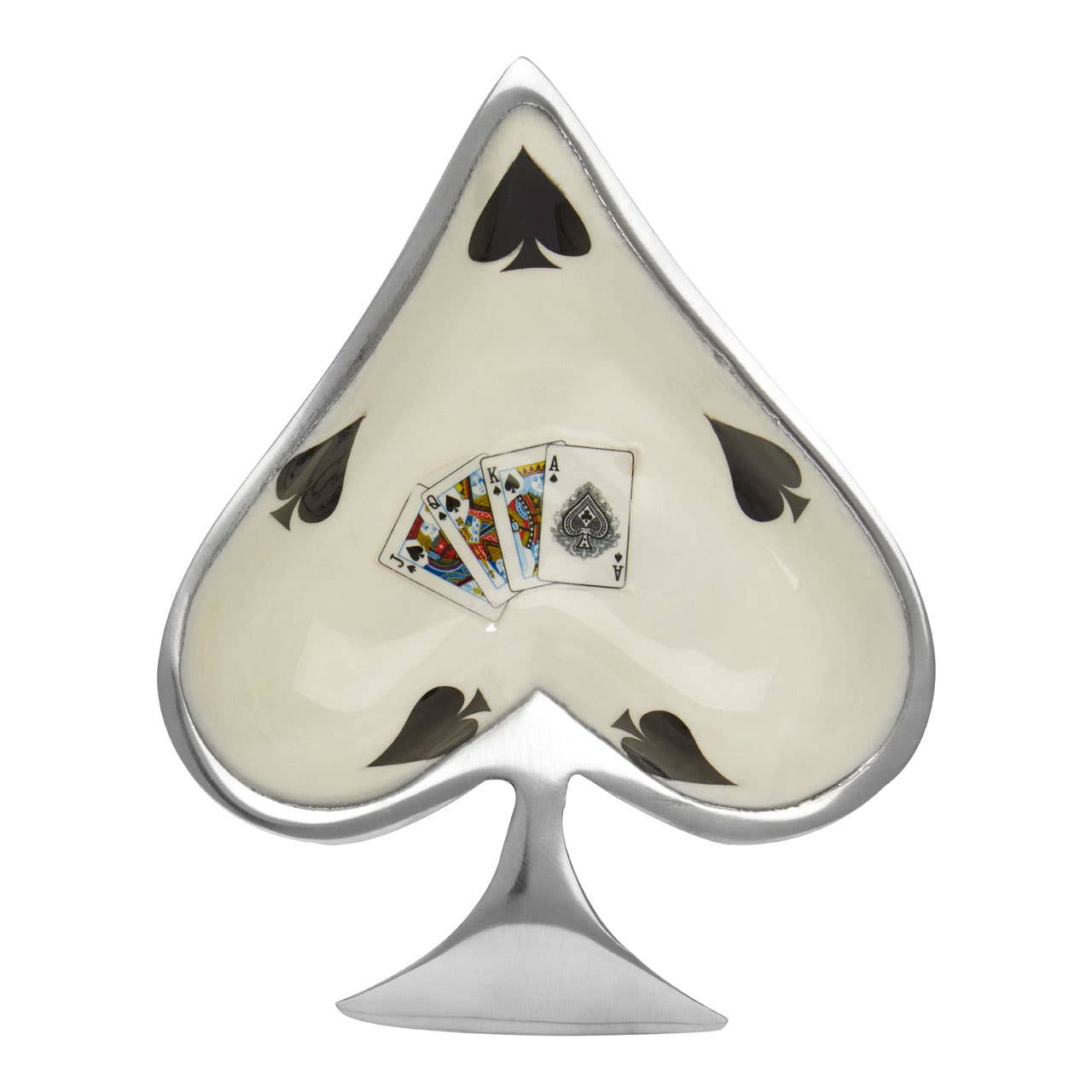 These four quirky decorative bowls take their design cues from a deck of cards. The four bowls are designed as shapes from a deck of cards: a diamond, heart, spade, and club. Each bowl boasts a cool silver finish, while the interiors are finished in an off-white tone. Decorating the centre of each bowl is a playful card illustration, featuring four cards from a deck.