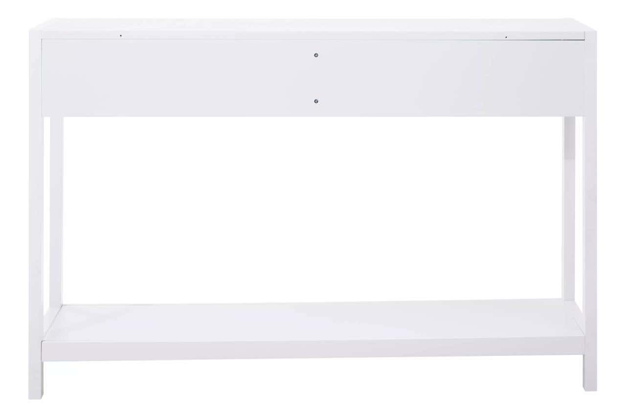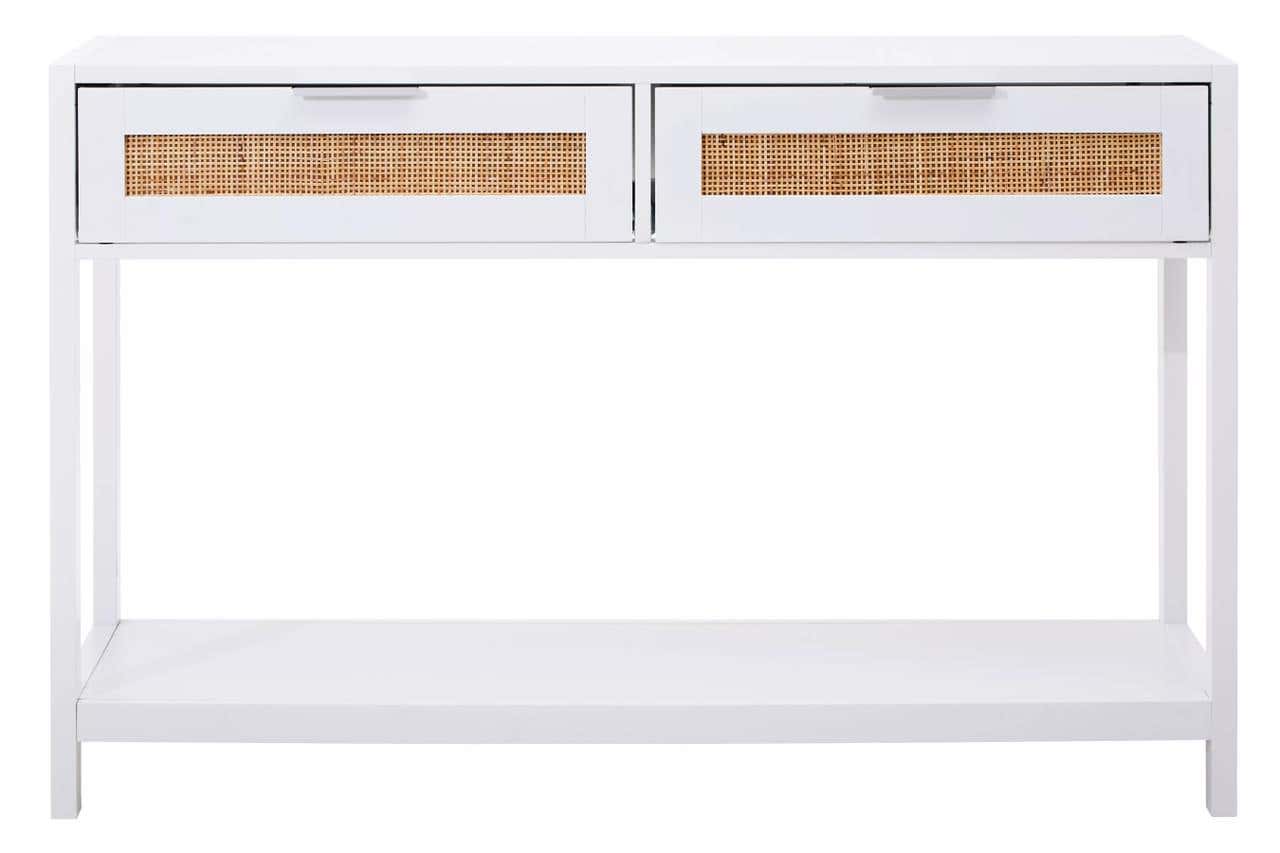 This console table is crafted from wood with a white paint finish. The natural rattan panels on the front of the drawers give the table a warm and earthy aesthetic. The table comes with an undershelf for additional storage.