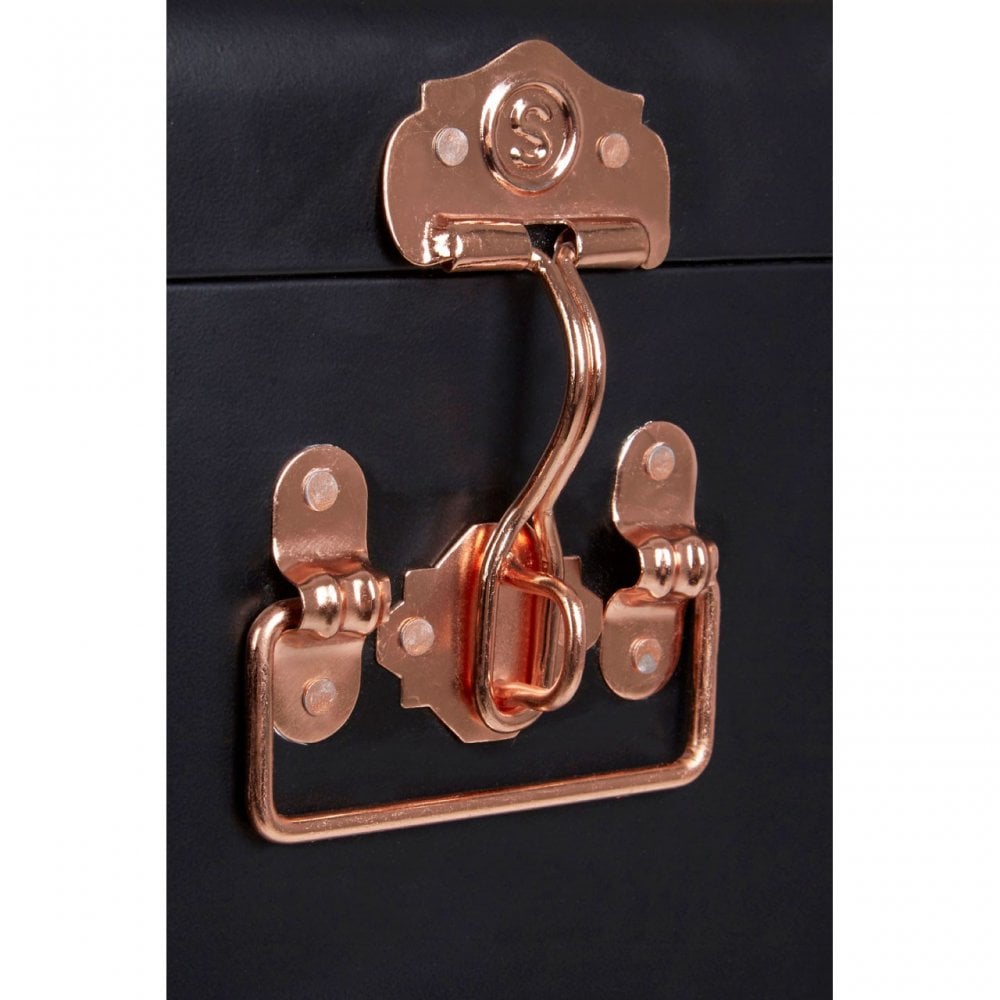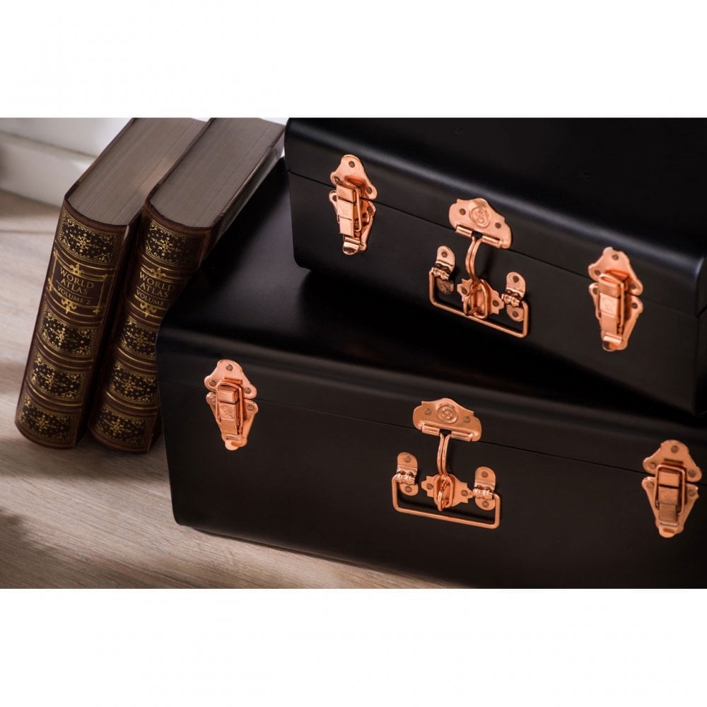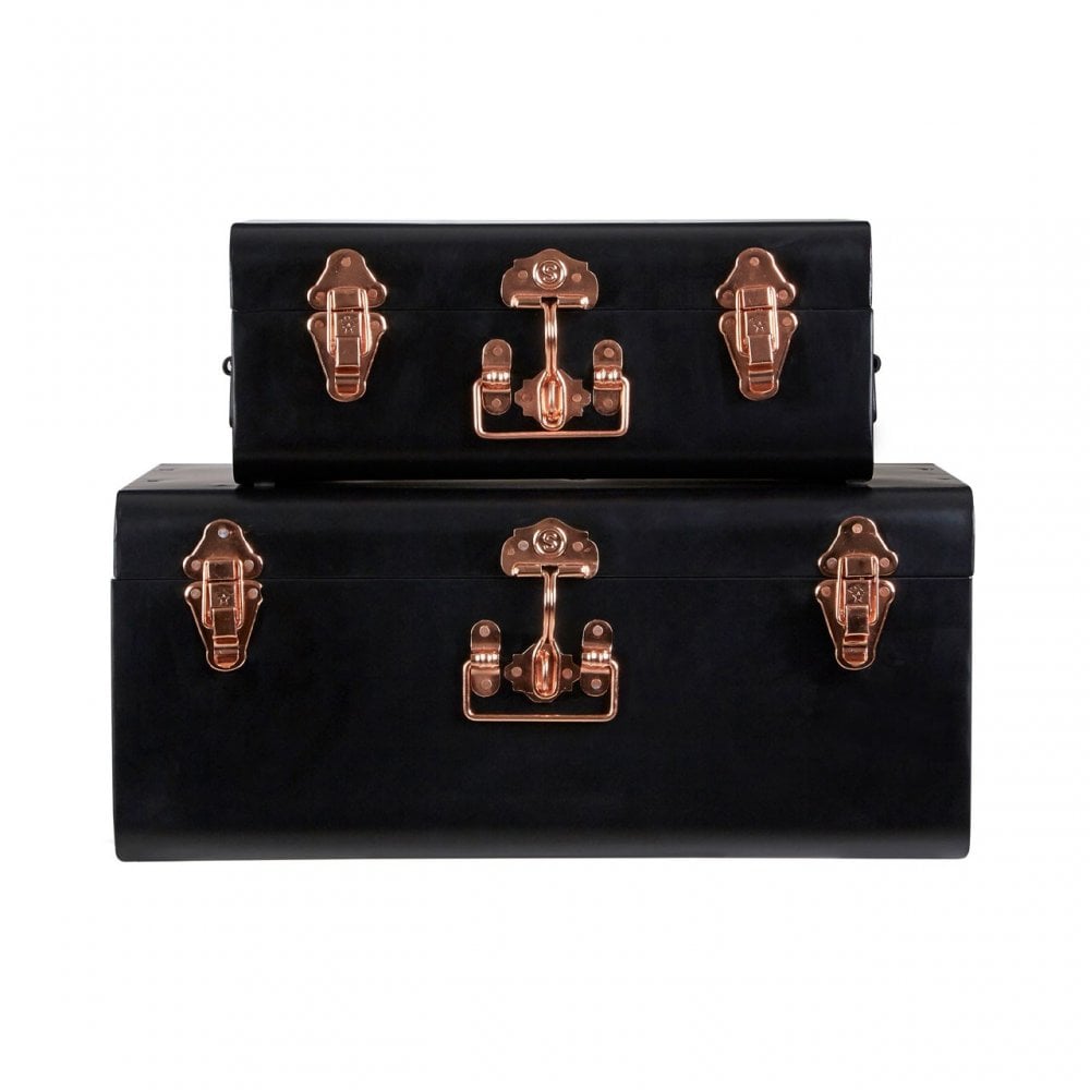 Keeping your home tidy without losing style, the set of 2 metal storage trunks will make a welcome addition to any Decor. The two trunks, 1 x small and 1 x large are made from robust galvanised iron ensuring strength and durability, while the black colour finish adds a fresh, retro look to them. Copper fastening clasps will help to keep your contents safely stored, while retaining the chic look. Two handles on the sides will make it easier for you to move them if required. Whether you place them in separate rooms or stack them on top of each other, the set of 2 storage trunks are perfect for keeping a organised and tidy home.