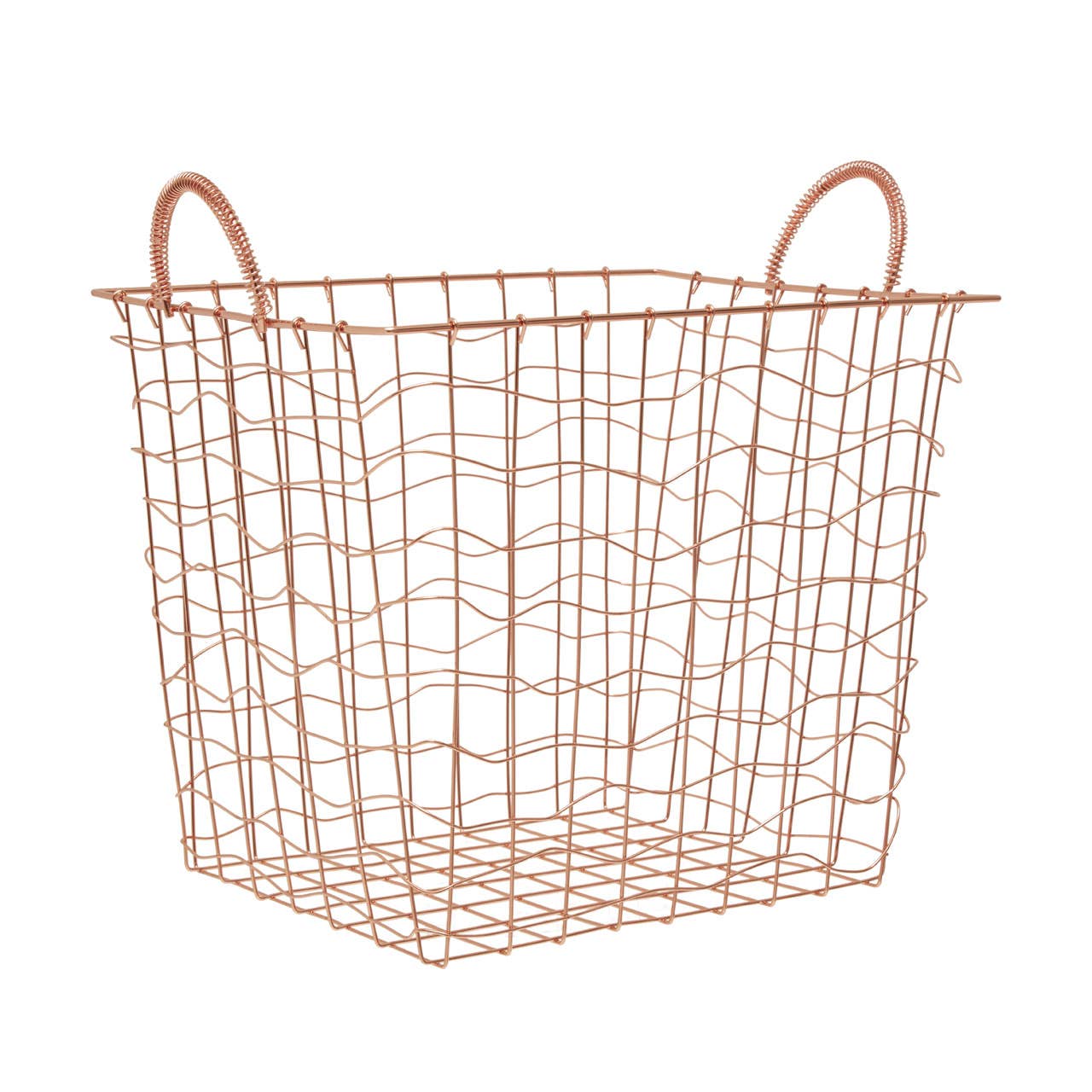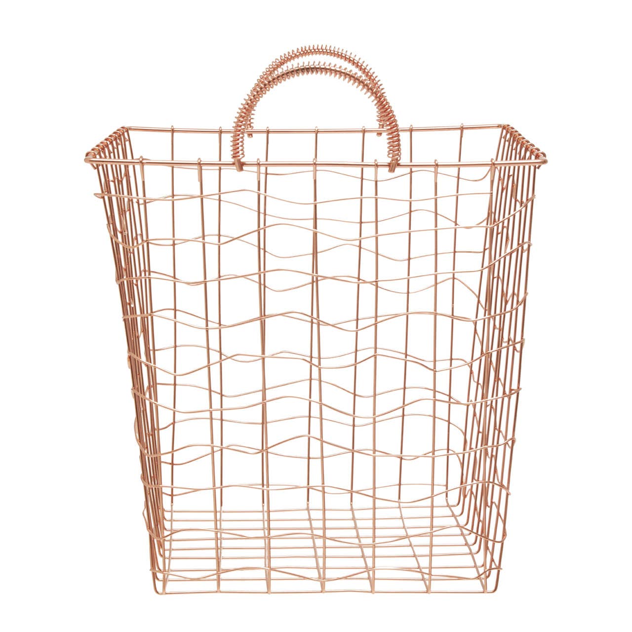 "Constructed from copper finish iron, this rectangular basket has vertical and wavy lines that combine to form its sleek wireframe. The basket has dual side handles with a matching spiral detail on them creating a decorative aesthetic."