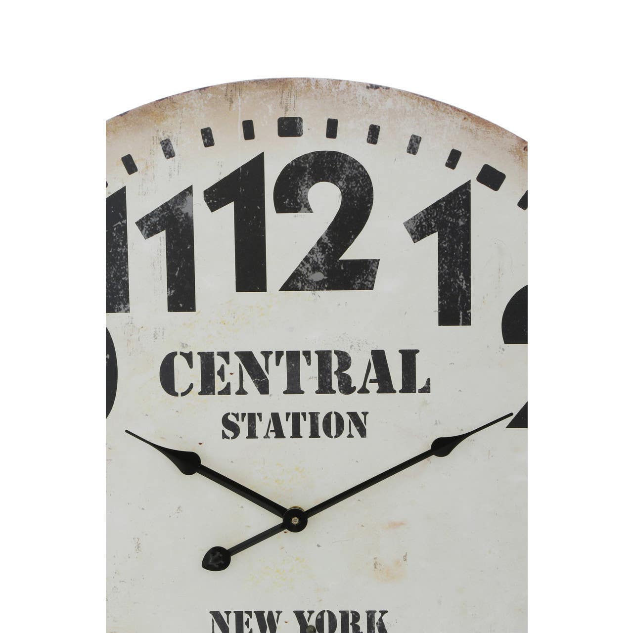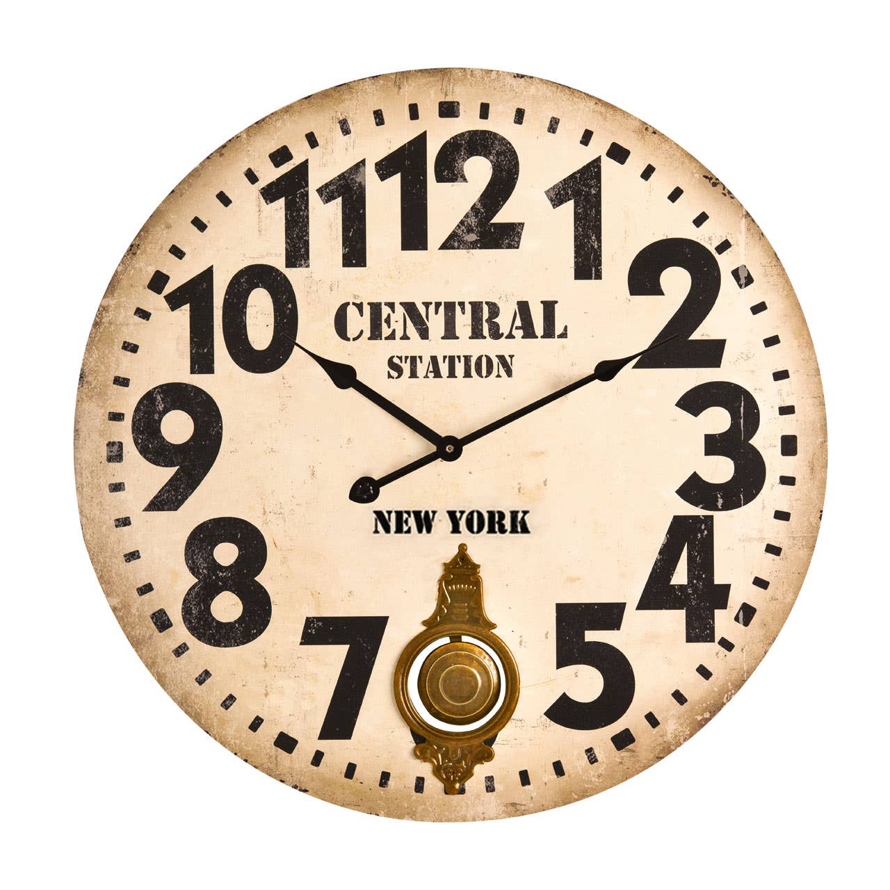 A striking feature on your wall, our large Central Station wall clock, with a pendulum, will bring an authentic and vintage look to your décor while providing a wonderful timepiece to keep track of time. Made from durable and strong MDF, the clock is given a distressed cream finish with large numbers in black ensuring it is easy to read, even at a glance. At the bottom of the clock face, a hole is cut that allows you to see the pendulum swing giving it a more traditional look and sound. Worded 'Central Station' and 'New York' detail further enhance the vintage look of the clock, Complementing a traditional decor our central station wall clock will remind you it's better late than never, but never late is better.